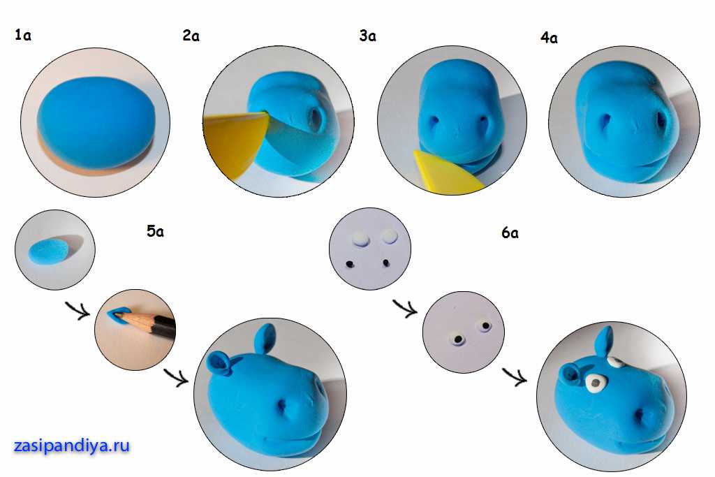 4. Скатываем 2 маленьких шарика (3 — 4 мм диаметром) и сминаем их в пальцах так, чтобы получились плоские кружочки. Это ушки – прикрепляем их к верхней части головы. Скатываем еще 2 маленьких белых шарика (глазки) и вставляем их в глазницы. Немного прижимаем их пальцами — для лучшей фиксации. Затем скатываем 2 совсем маленьких шарика диаметром 1 — 2 мм из серого пластилина — для зрачков. Доделываем глазки бегемота. Делаем небольшой рот (просто надрезаем стеком пластилин) Голова нашего бегемота готова.