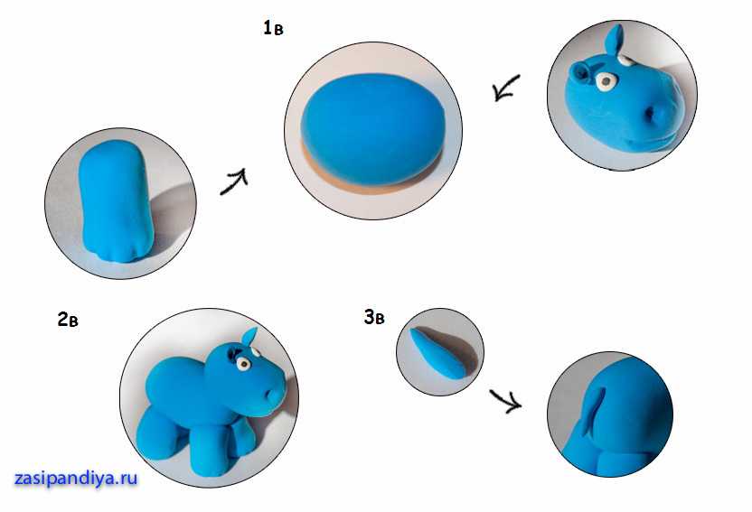 Не тут-то было! Получался отчётливый носорогопотам. Так что переломила я свою лень,перемяла пластилин и — новое воплощение — лепим бегемота с нуля.