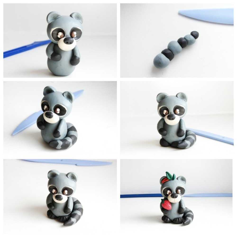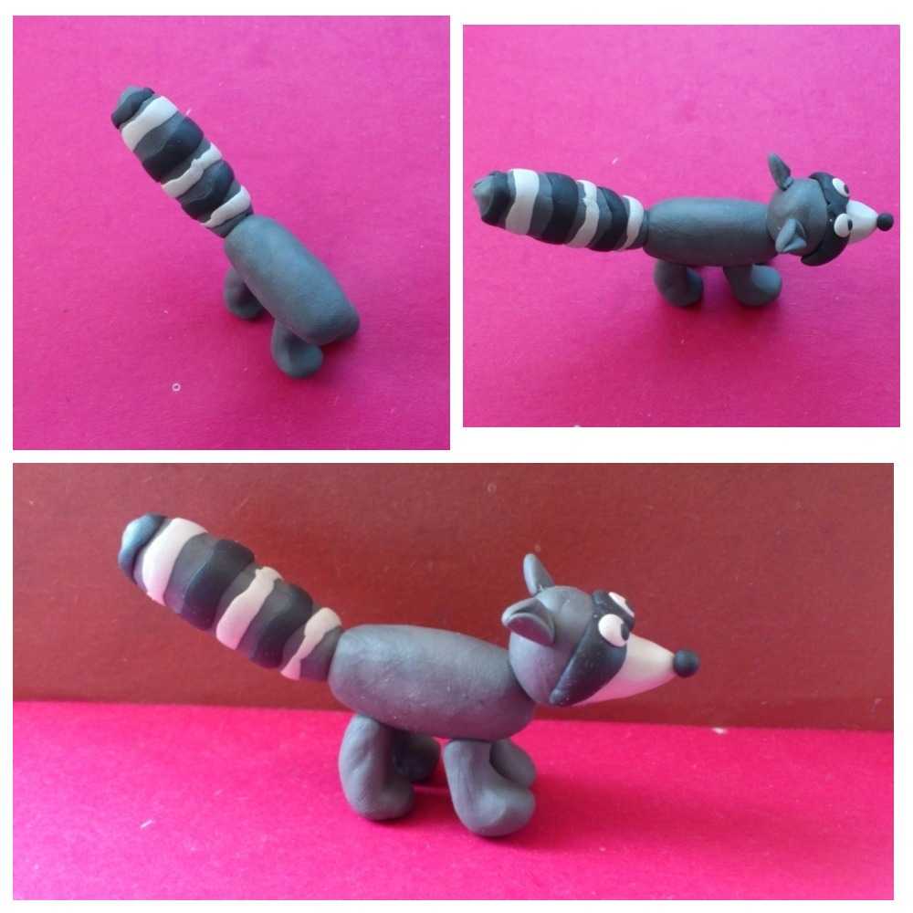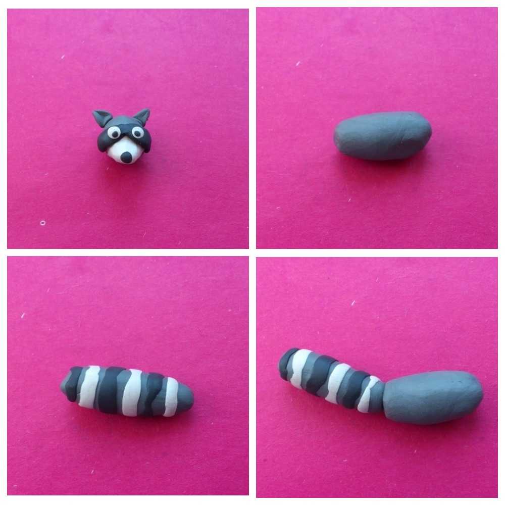 Животное имеет полосатый хвост. Поэтому скатываем длинную белую колбаску и накладываем на нее черные полоски. Задние лапы массивные, поэтому понадобится скатать 2 толстых валика, а затем их согнуть. Передние конечности тоньше в 2 раза. К ним прикрепляют маленькие колбаски-пальцы.