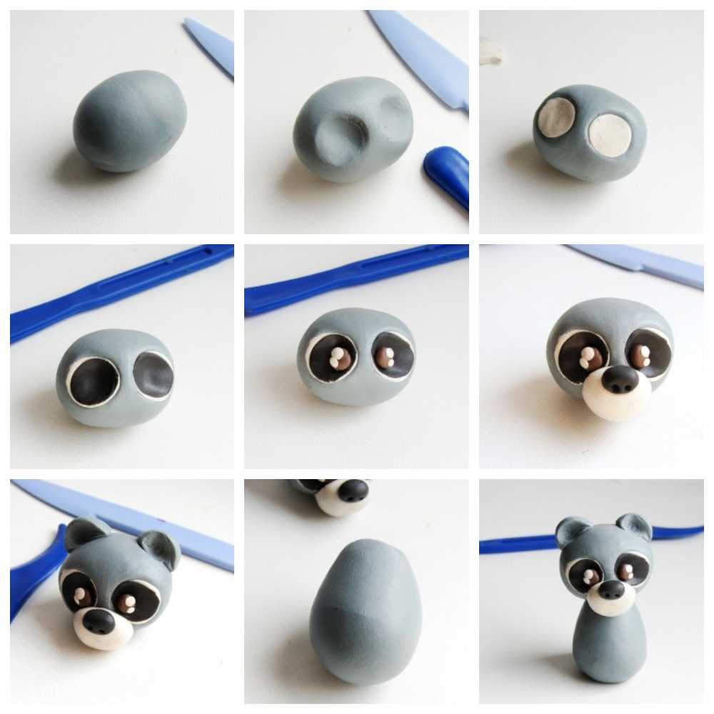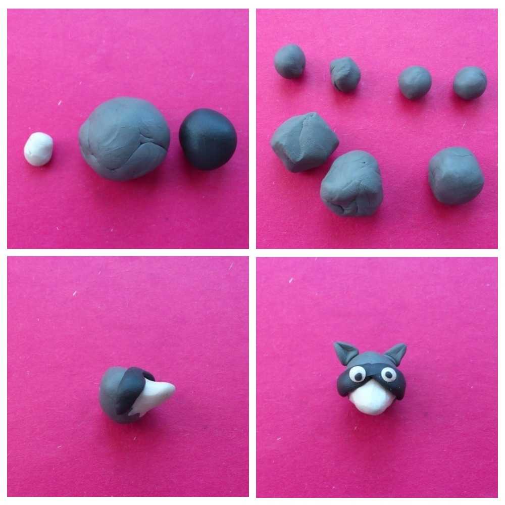 Чтобы сделать мордочку, скатывают небольшой шарик из светлого оттенка серого. К нему потребуется прилепить белый кружочек и сформировать острый край (нос). На стык белого и серого пластилина лепят полосу, сделанную из темно-серого цвета. Когда маска енота будет сформирована, останется сделать глаза из 2 белых лепешек с темными точками в центре.