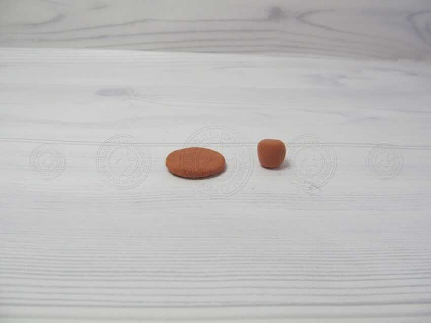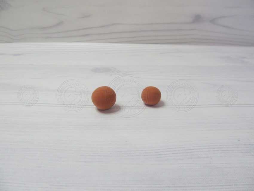 13. Тот шар, что побольше необходимо расплющить. Лучше всего воспользоваться твердым предметом, чтобы блин получится ровным. Вторую деталь мы поджимаем пальцами таким образом, чтобы вышла горошина с узкой стороной внизу.