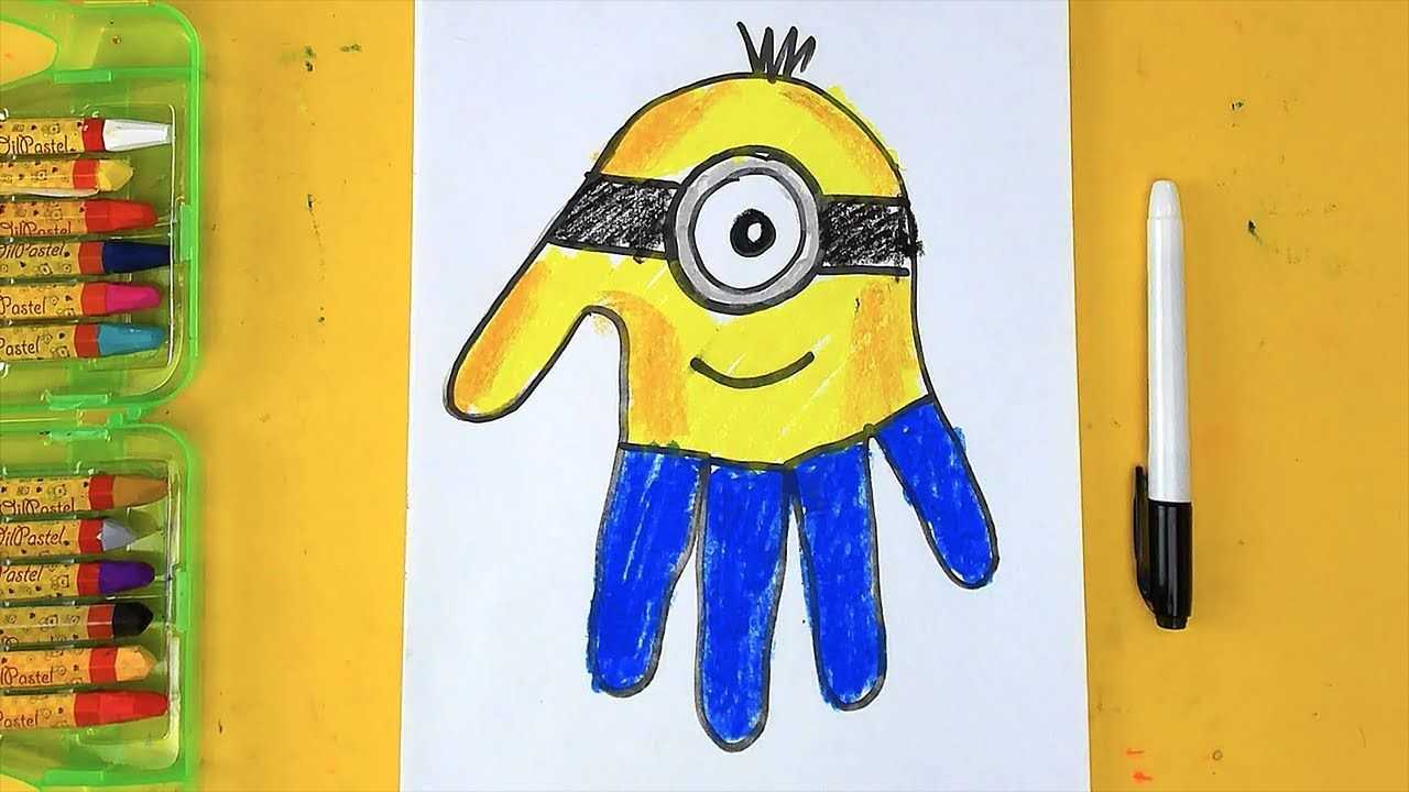 Самым маленьким художникам подойдет миньон из ладошки. Помогите малышу обвести ладонь, а дальше объясните, как дорисовать героя. Можно вместе с рисованием и счет потренировать: сосчитать глаза, пальчики.