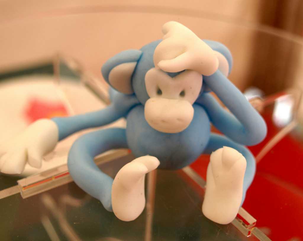 Если вы не знаете, как слепить из пластилина животных, читайте наши рекомендации далее. Следующим этапом разберемся, как слепить обезьяну, используя серый и персиковый цвета. Голова и туловище у примата лепится из шариков, только тело нужно сделать большего размера. Руки и ноги шимпанзе представлены длинными и тонкими палочками, которые пальцами примазываются к туловищу сверху и снизу.