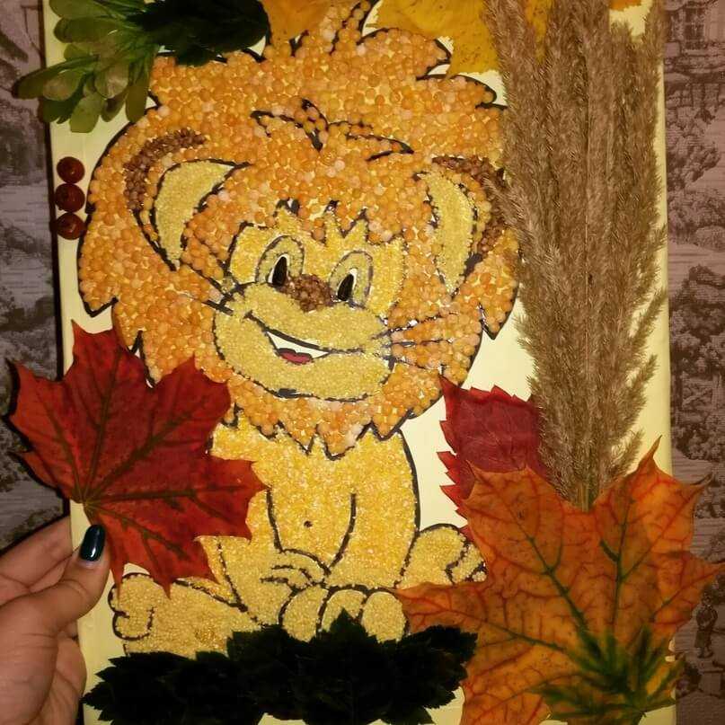 Обратите внимание, сколько разных материалов собрано в одной поделке. Здесь и раскрашенные шишки, и камушки, и листочки, и даже фасоль