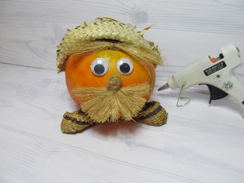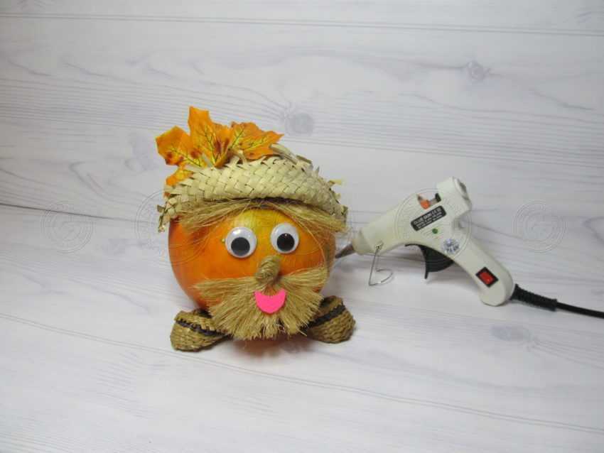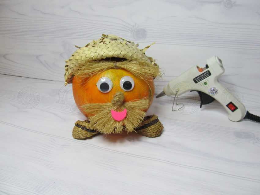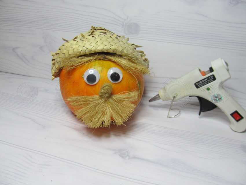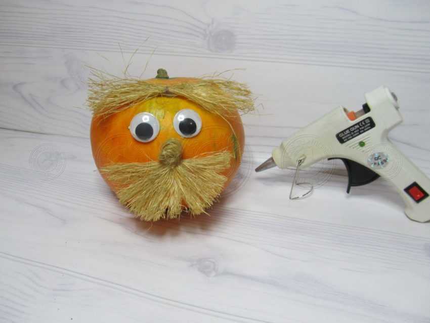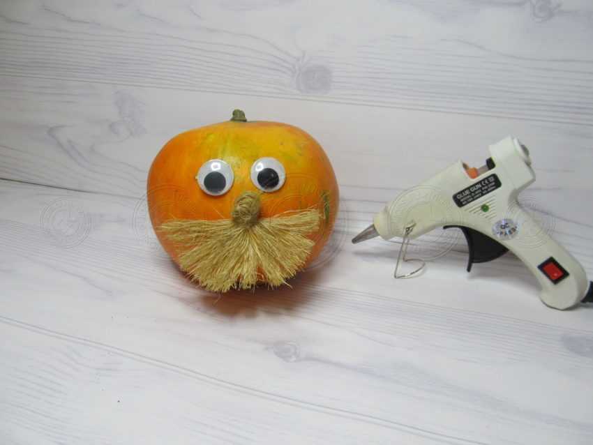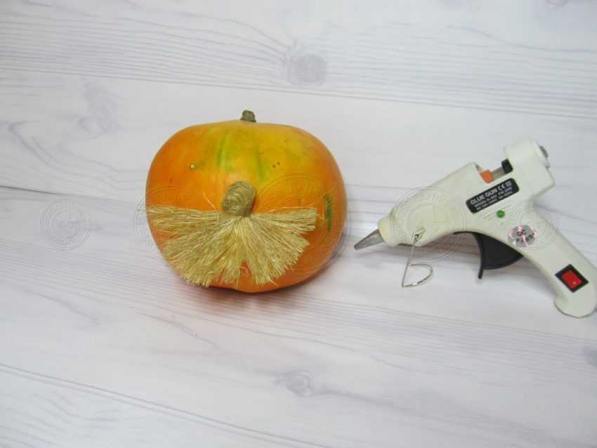 5. Мы будем использовать клеевой пистолет, но вы в своем творчестве вправе обратится к любому другому средству скрепления. Присоедините нос с ушами к середине тыквы. Если волосы не держаться, то дополнительно проработайте их, аккуратно нанося по краям клеевой раствор.