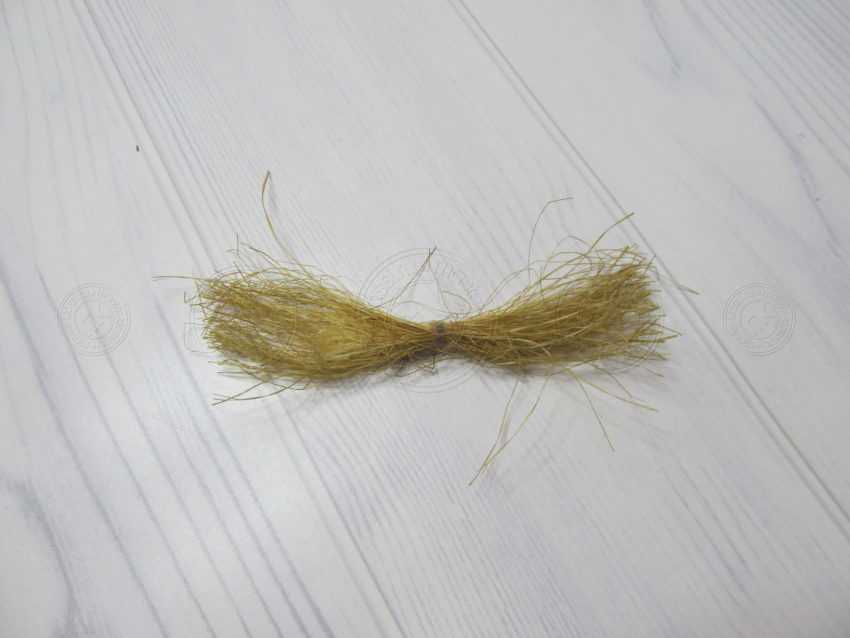 3. Делаем из пакли волосы, перевязав в середине той же нитью. Если вы используете джут, то воспользуйтесь острым предметом, чтобы распушить его концы. Середину аналогично придется плотно чем-то зафиксировать, чтобы конструкция не распалась на волокна. Общая длинна волос должна составлять ширине вашей тыквы.