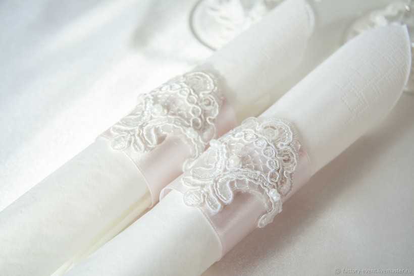 Не менее оригинально смотрятся вязаные кольца. Следует взять салфетку и оформить ее с помощью полоски вязаного кружева. Подойдет и обычная кружевная ткань. Для крепления используется застежка, но нередко справляются без нее, поскольку цельное кольцо легко растягивается.