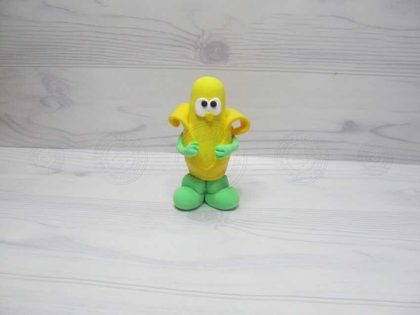 9) Милая обезьянка из пластилина готова. Она ждет угощение – вкусный спелый банан. Вы можете его слепить из кусочка желтого пластилина или использовать уже готовый из детского набора.