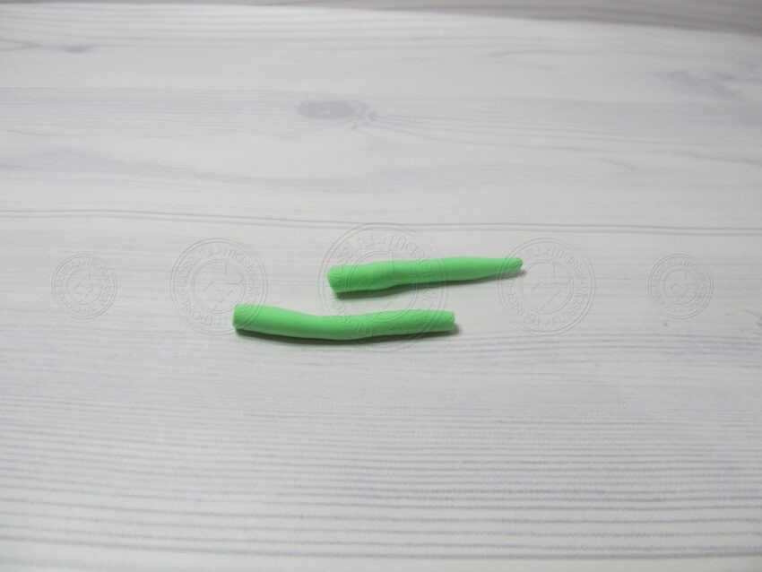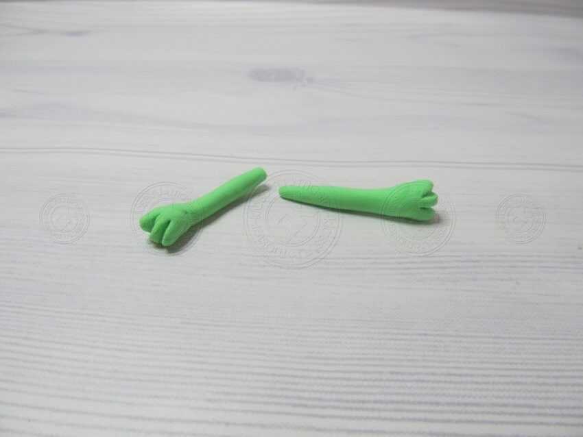 10. Мы надеемся, что вы не убрали далеко зеленый пластилин, так как из него нам необходимо будет сделать руки. Для этого скатайте две примерно одинаковых колбаски. Один конец которых должен быть чуть шире второго.