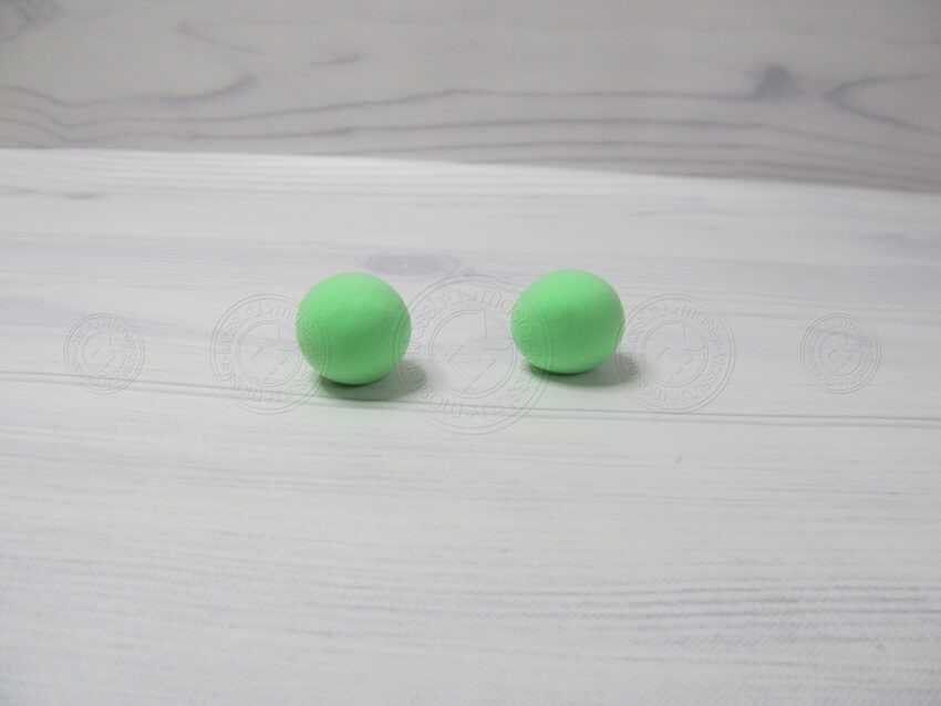 13. Приступаем к формированию лицевой части. Для этого возьмите белый пластилин и оторвите от него два кусочка. Так как в будущем это будут глаза, их размер не должен быть большим. Когда все будет готово, скатайте из них шарики.