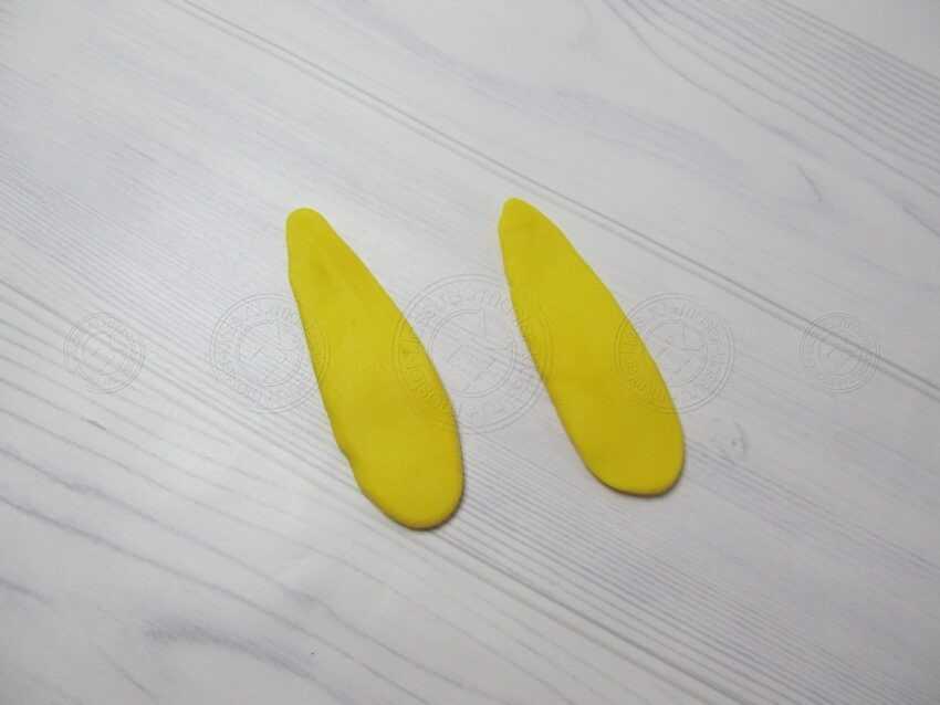 4. Отрываем от желтого пластилина еще два кусочка и раскатав шарики, расплющиваем их в продолговатую плоскость. Когда все буде готово, возьмите пластиковый нож и вырежьте из каждой часть будущей кожуры банана.