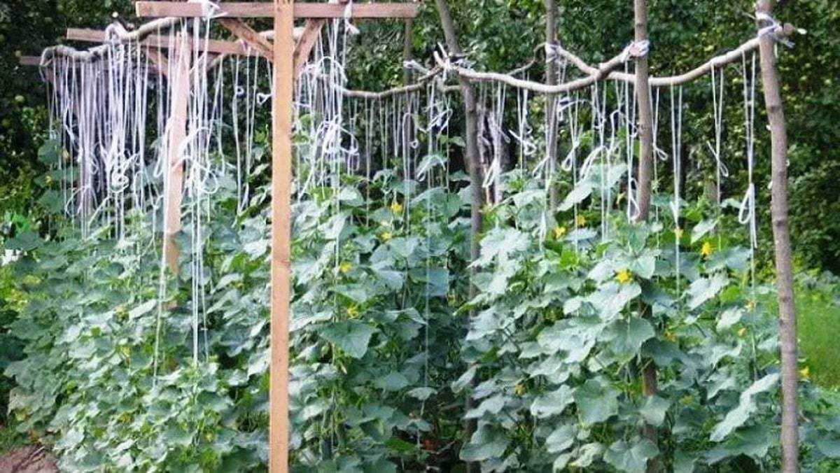 Решетчатые шпалеры применяются чаще в южных регионах, где весной не нужно закрывать растения. В других областях России огурцы возделывают на дугах, закрытых пленкой. К ним прикрепляют веревку или проволоку, которые опускаются вниз. Огурцы, вырастая, самостоятельно цепляются за веревку своими усами.