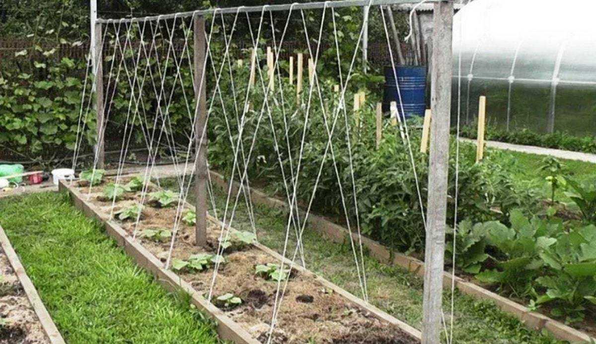 Столбы нужно соединить перекладиной в верхних частях. На каждую из них с двух сторон забиваются гвозди через каждые 25 см. К ним привязывается проволока или веревка, которая свисает вниз до уровня почвы. На краях делают петли, чтобы потом накинуть их на растения. По мере роста плети сами зацепятся за проволоку усами. Веревку нельзя натягивать сильно, так как огурцы могут вырвать сами себя из почвы.