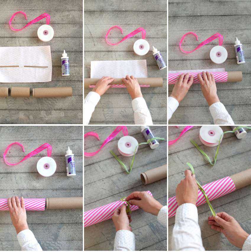 Возьмите упаковочную бумагу, защелку и картонную трубку. Нанесите клей на конец бумаги, затем плотно скатайте и запечатайте. Снимите одну сторону и завяжите конец лентой.
