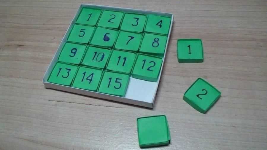 Привычная игра «15» возможна и в таком исполнении. Просто из однотонной бумаги делаем квадратики с тонким ребром, пишем на фронтальной стороне каждого цифры от «1» до «15» и вкладываем все это в коробочку, также выполненную из бумаги. И можно начинать ломать голову над том, как собрать цифры по порядку.