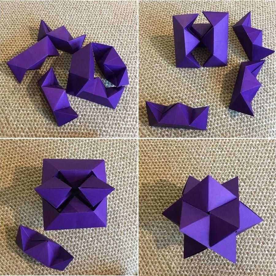 Такая головоломка требует усидчивости от вас и бумагу нескольких цветов, лучше, если она будет цветной с двух сторон. Каждая деталь головоломки собирается отдельно, и потом вся фигура собирается вместе. Достаточно сложно на первый взгляд, но через несколько деталей вы будете делать ее на автомате. Побочным эффектом такой головоломки может стать использование головоломки как игрушки-антистресс.