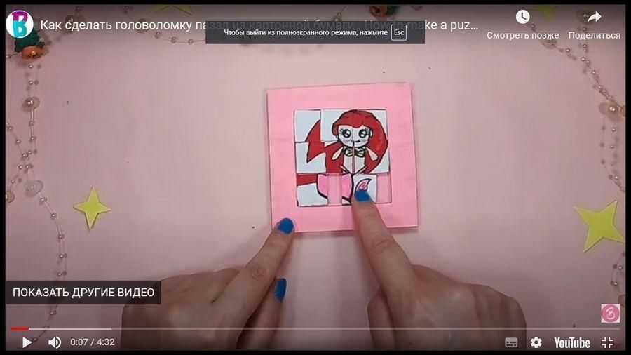 Помните игру «15» . Это вариация на тему, только вместо цифр — изображение русалки, которую также надо собрать. А изготовление такой головоломки просто: квадрат-рамка из гофрокартона, в которую вставляются квадратики с рисунком, также из картона, который надо собрать.