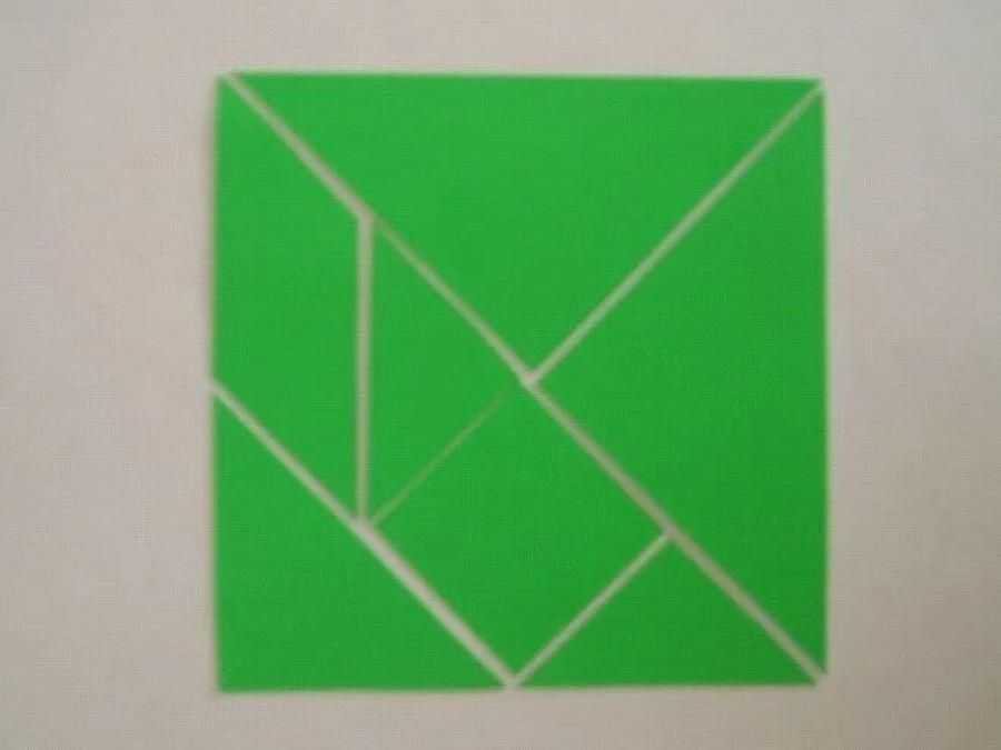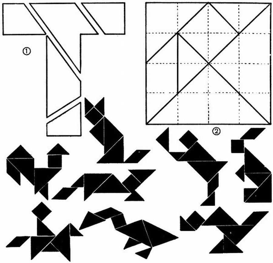 Квадрат из картона следует разрезать на простые фигуры. И из них можно собирать различные фигуры, изображения животных и прочее, решая все время новые и новые задачки.