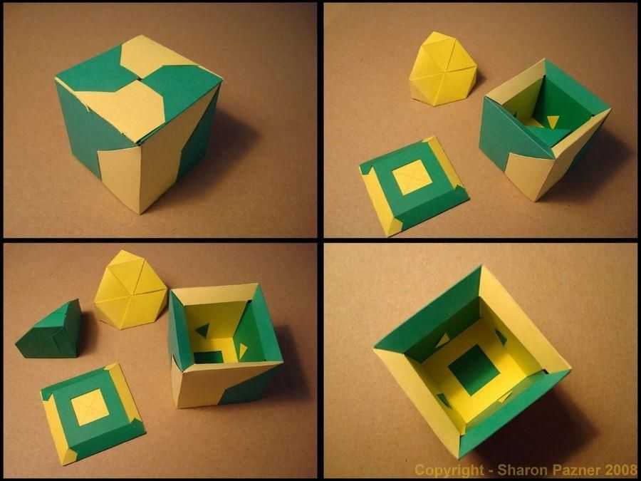 Как из бумаги сделать головоломку такого типа? Выбранная заготовка складывается в многогранник. Секторы, объединившись вместе, составляют определенный рисунок, когда игрушку выворачивают.