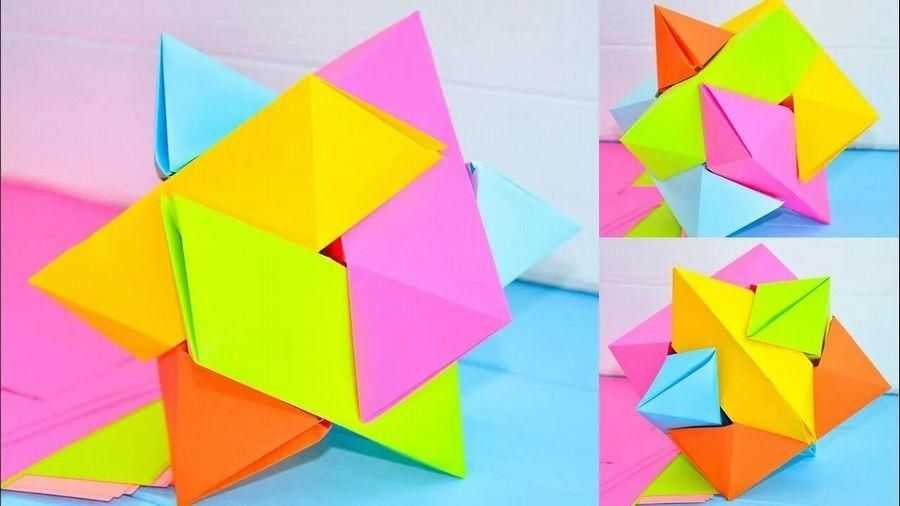 Для создания следующей головоломки потребуется немного поломать голову. Она выполнена из нескольких разноцветных листов бумаги. Снова делаются детальки, которые собираются по определенному алгоритму. После этого — все готово к использованию.