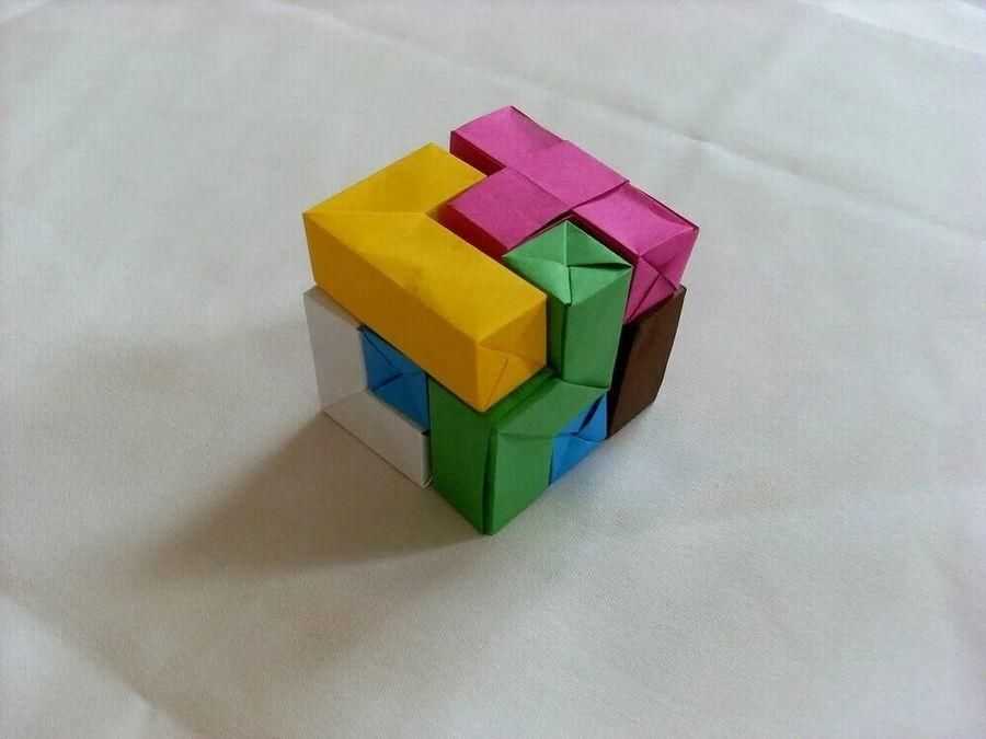 Почти кубик-рубик из бумаги. Здесь снова нужен набор цветной бумаги, но теперь все собираемые из нее детальки будут разными по форме. Но каждая деталь — как будто сама состоит из многочисленных кубиков со стороной 1Х1. Это практически трехмерный тетрис. Все детальки обязательно делаем из разных цветов, так легче будет потом собирать квадрат и понимать, что и где не так.