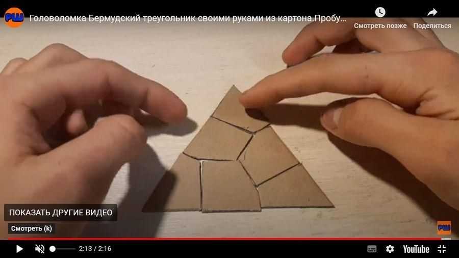 Вырезав определенные фигурки, количеством шесть штук — две пары с определенными размерами и формой. Вырезав их из картона, надо попытаться собрать из набора фигурок «бермудский треугольник». Вот такой, как на рисунке.