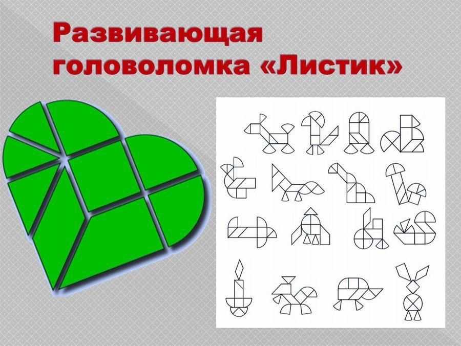 По принципу предыдущей головоломки исполняется и эта. Разница лишь в том, что вырезаются все фигурки (конечно, же другой формы) из листа, который имеет форму Сердца или Листика, тут уж кому как удобнее. Но развлекаться такой головоломкой можно до бесконечности, а времени, которое вы потратите на ее создание, будет совсем немного.