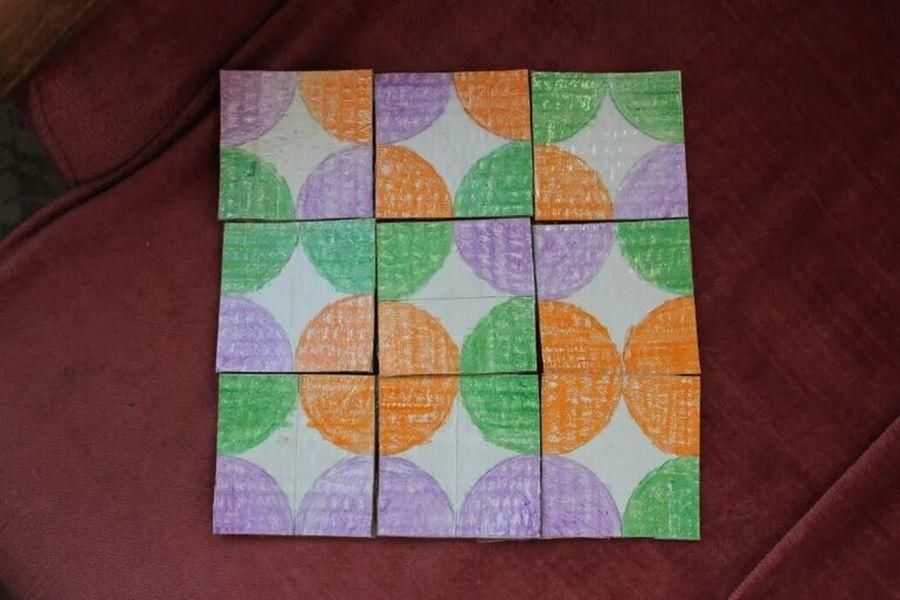 Еще один вариант с картонными квадратиками. На этот раз их нужно девять штук одного размера. На каждом из них рисуется четверть круга разного цвета — в разных вариантах. А после этого надо собрать круги одного цвета.