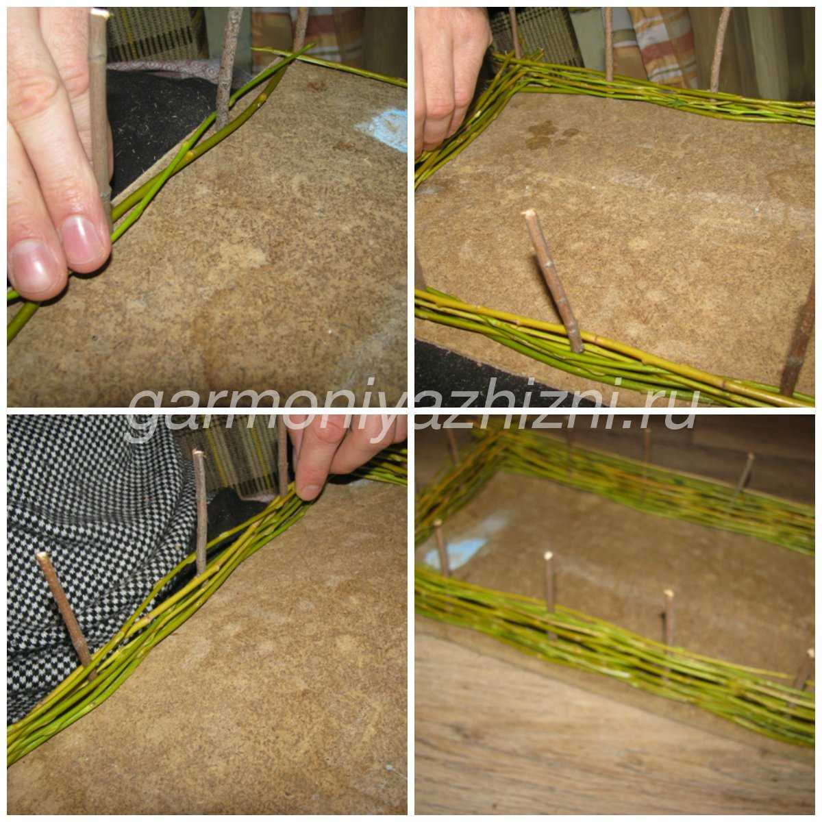 Теперь приготовим ивовые прутья. Нужно нарезать ивовые ветки на прутья по длине и ширине вашей дощечки таким образом, чтобы на пару сантиметров с обеих сторон веточки выступали. К примеру, наша длина дощечки 45 см, значит прутик мы отрезаем около 50 см и таких прутьев нам нужно много. Ширина дощечки 25 см, значит еще потребуются ивовые прутья по 30 см. Тоже много, столько же, сколько и по 50 см.
