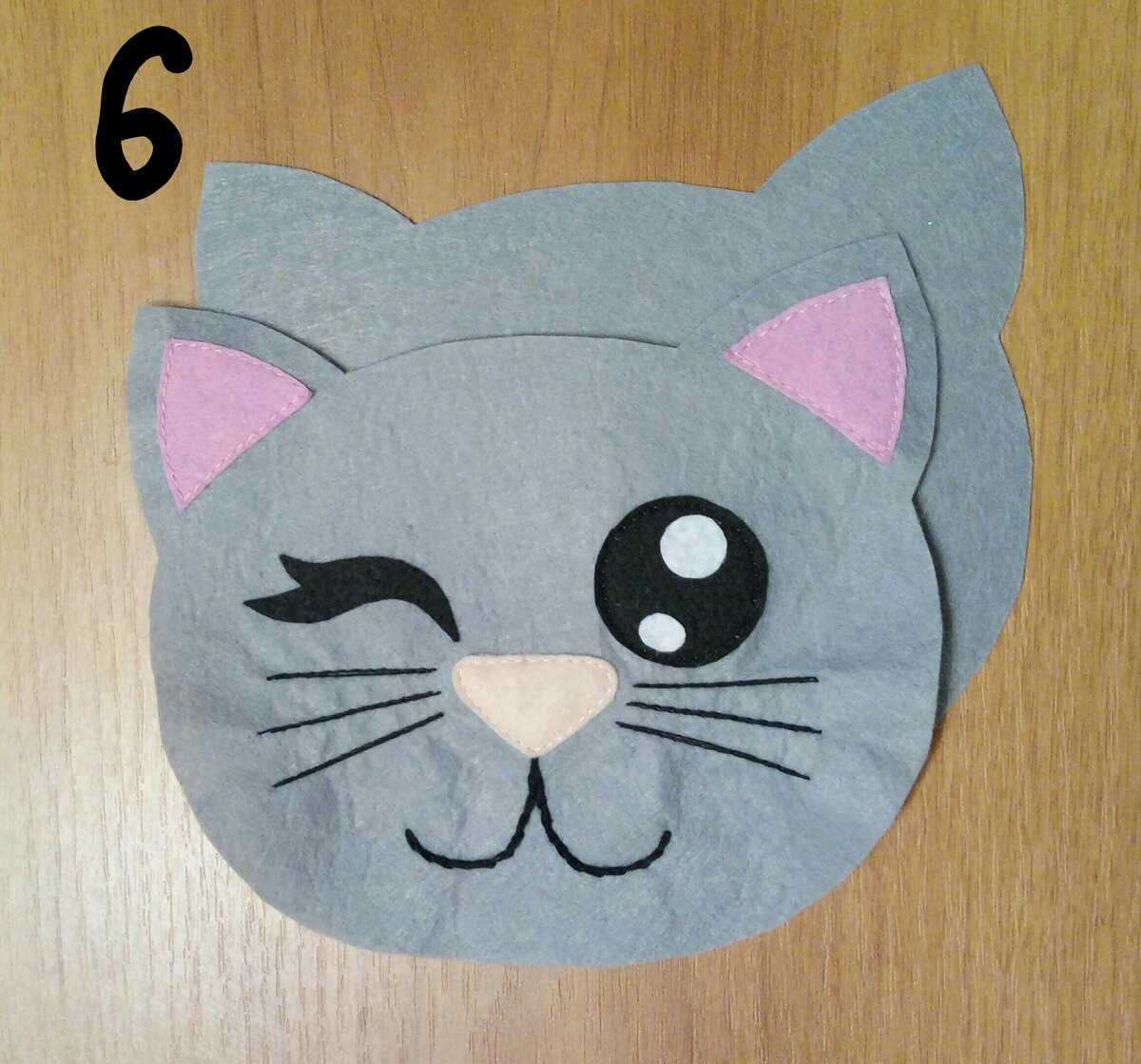 Делать части кошечки нужно отдельно, так же как и две ее стороны: лицевая и задняя. По контуру ножом или ножницами вырезаем детали. Мордочку украшаем глазами-пуговками, нос и рот – разноцветными ниточками.