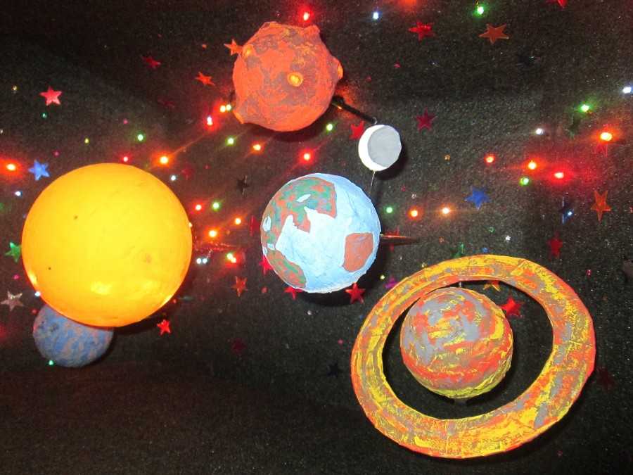 - Закончив, выложите планеты по порядку и прикрепите к орбитам, на которых они должны располагаться. Процесс лепки поделки можно сделать еще более творческим, если нарисовать на листе луноход или комету.