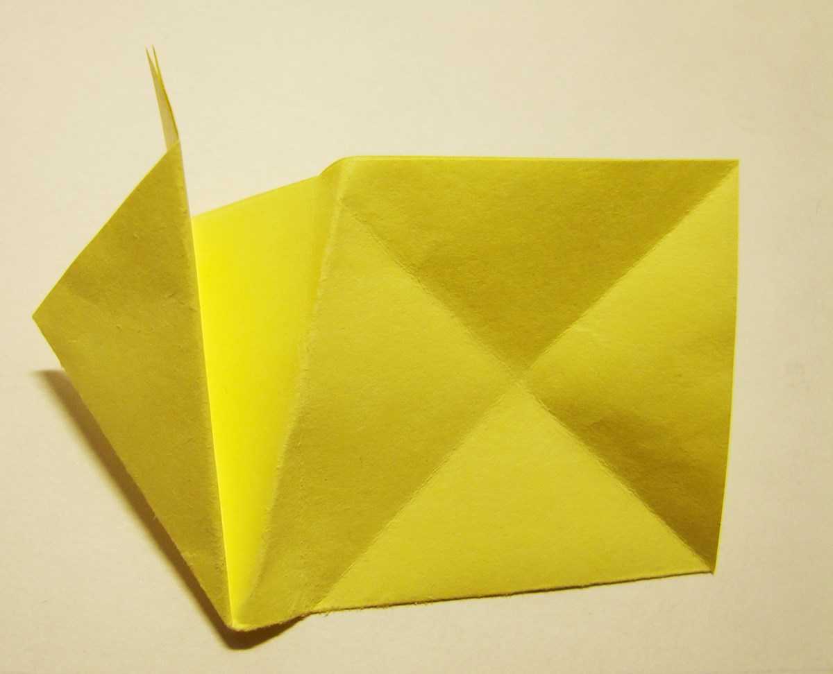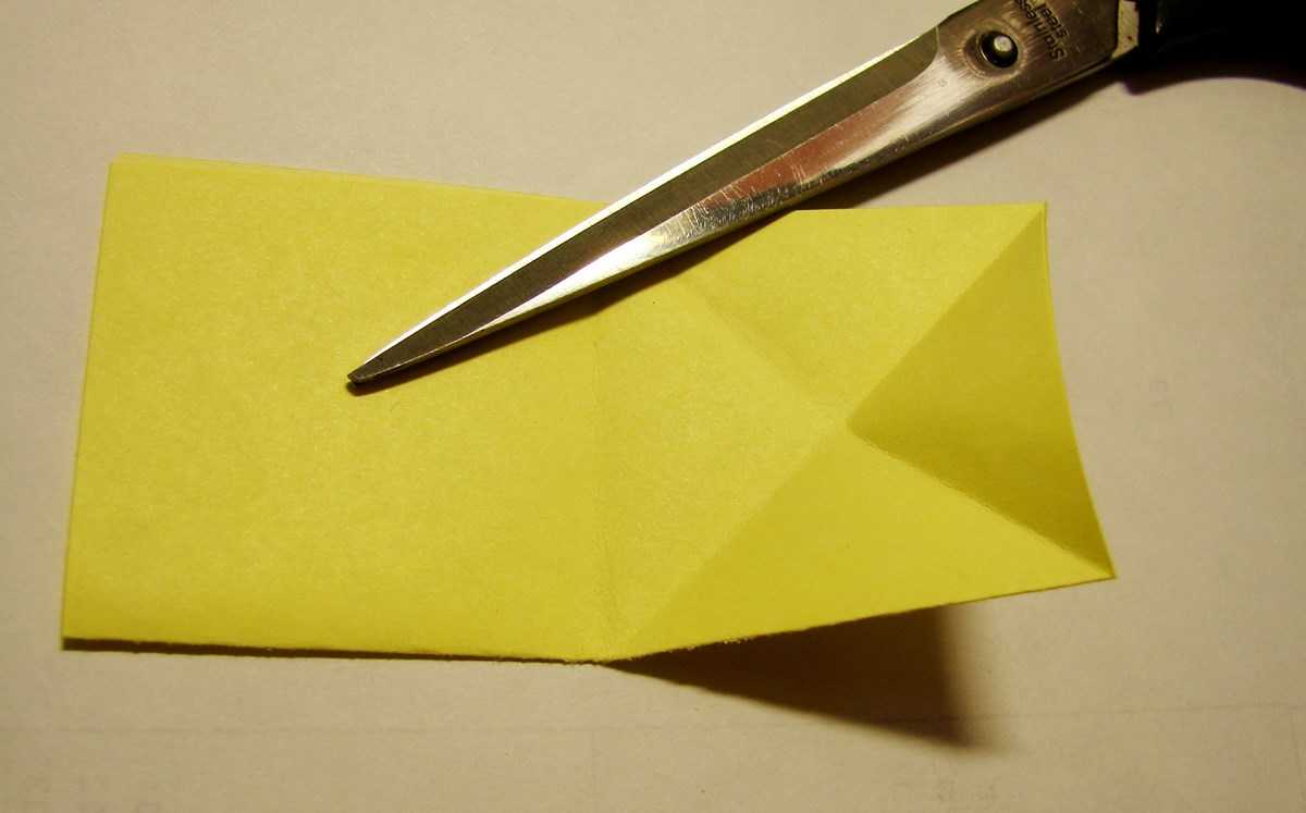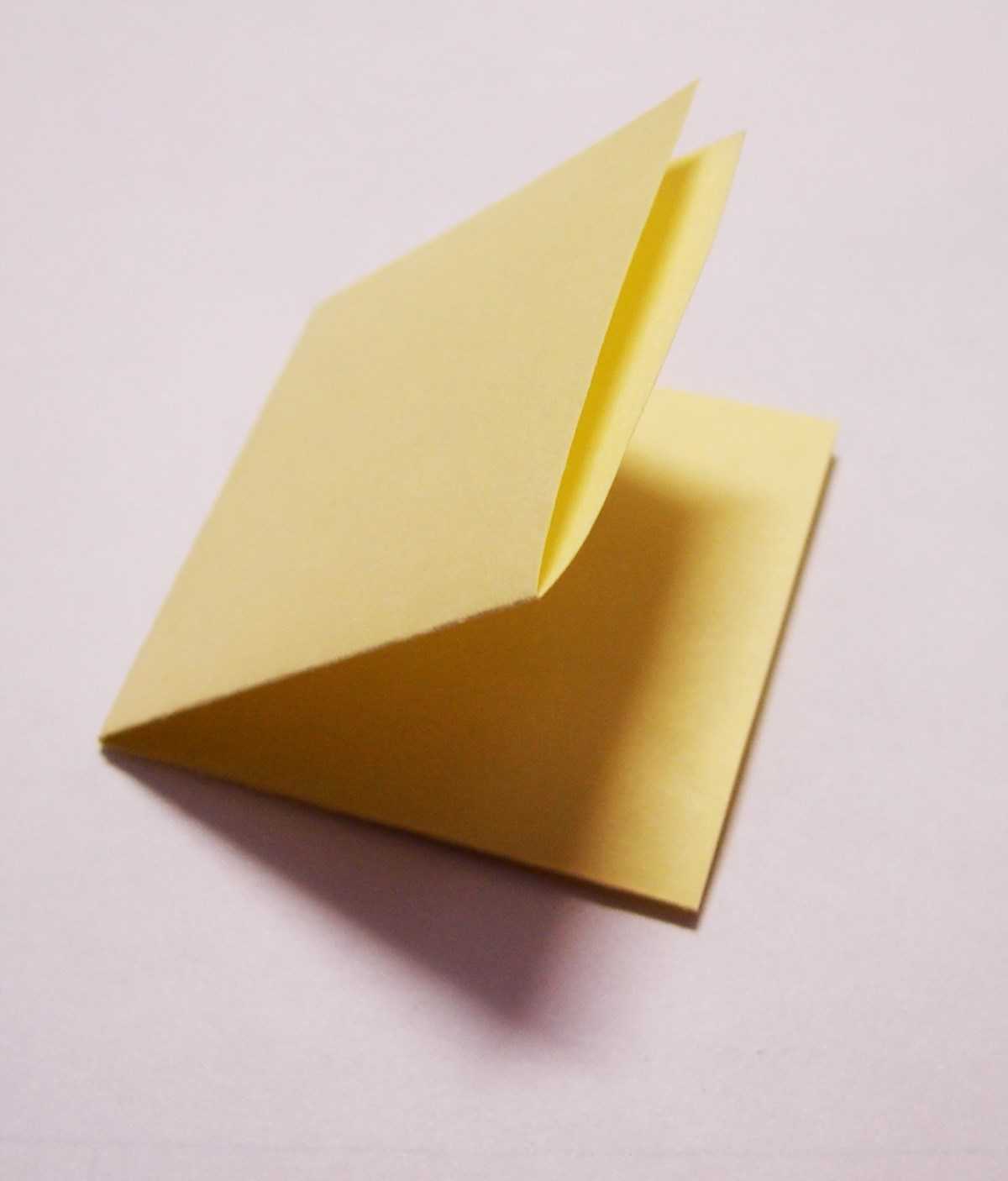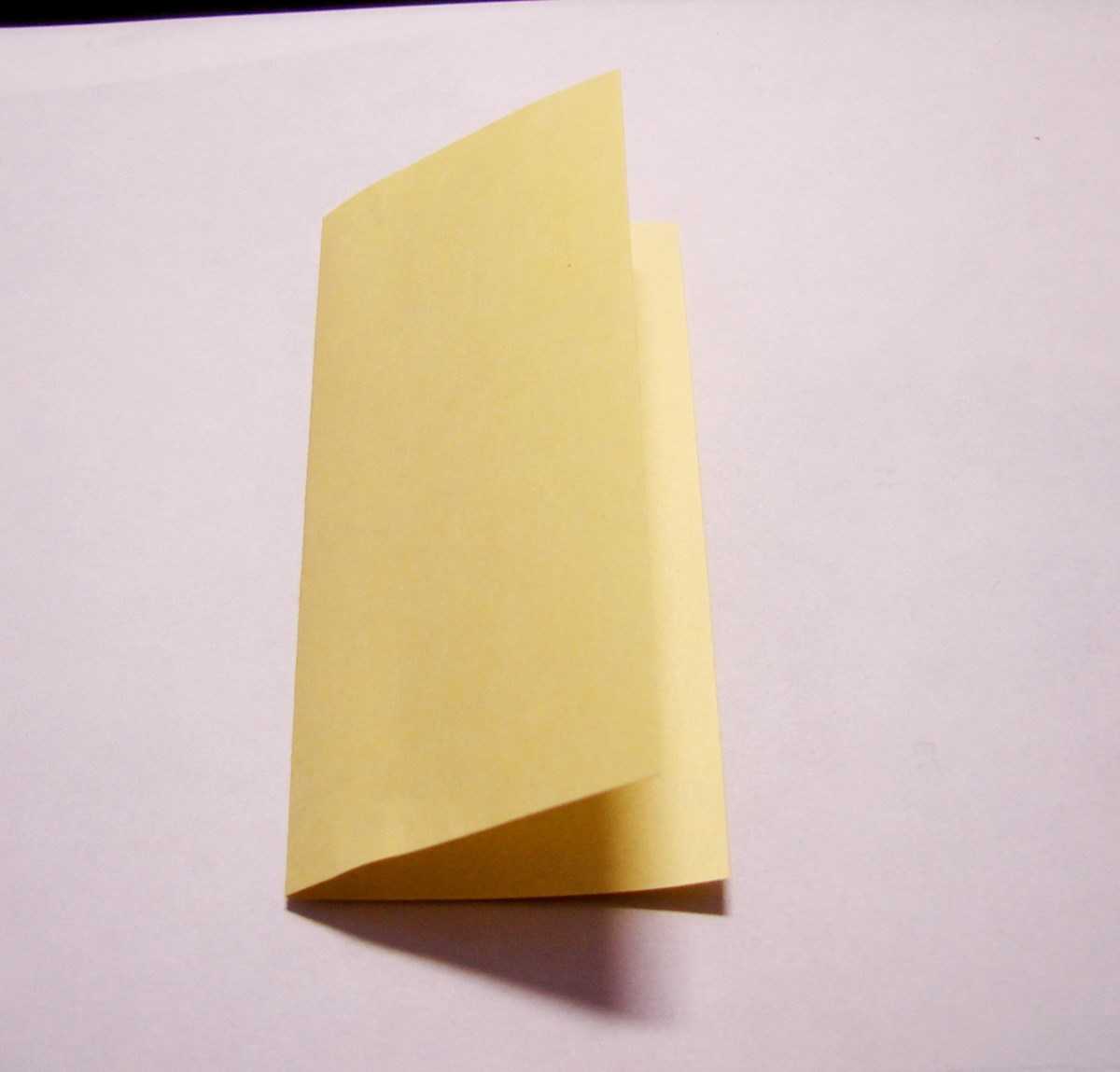1. Вырезаем квадрат из желтой бумаги (10х10 см). Сгибаем его пополам от себя (сгиб должен «смотреть» на вас).