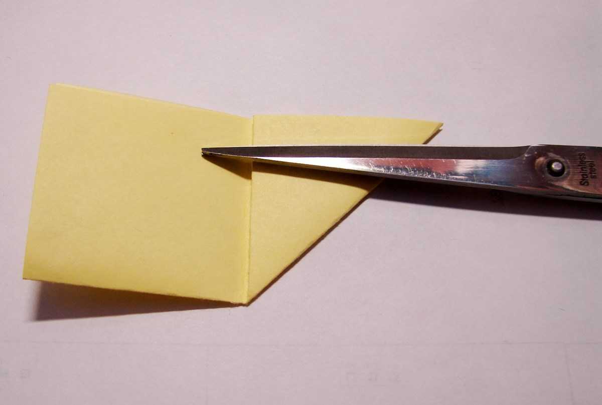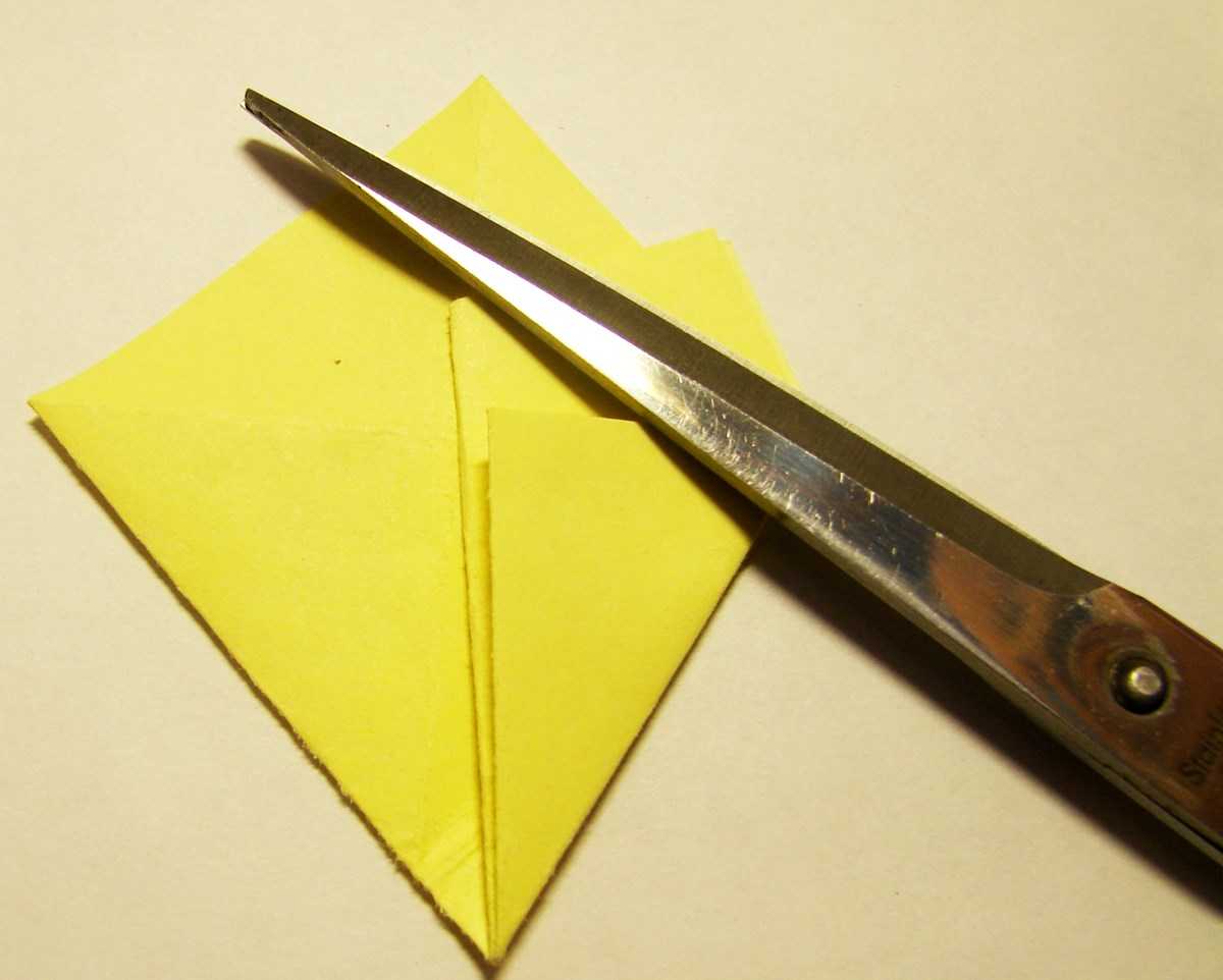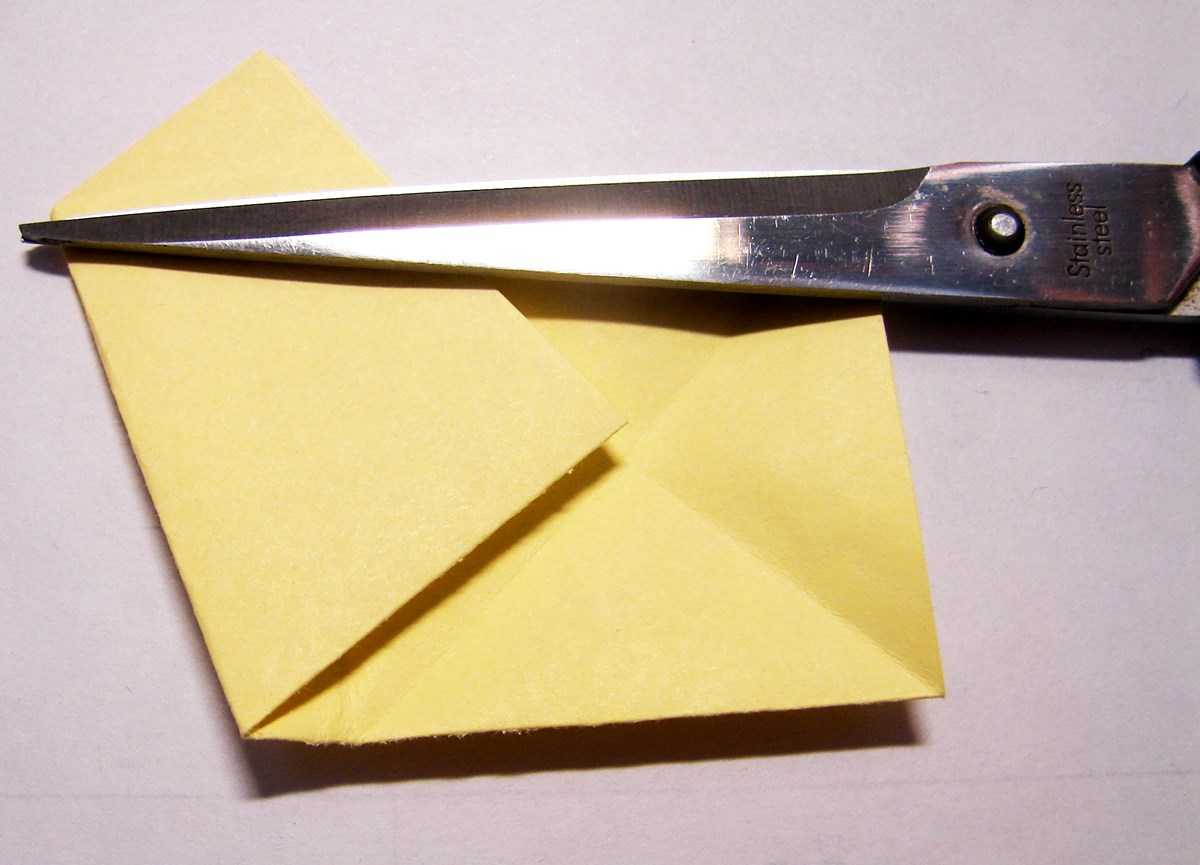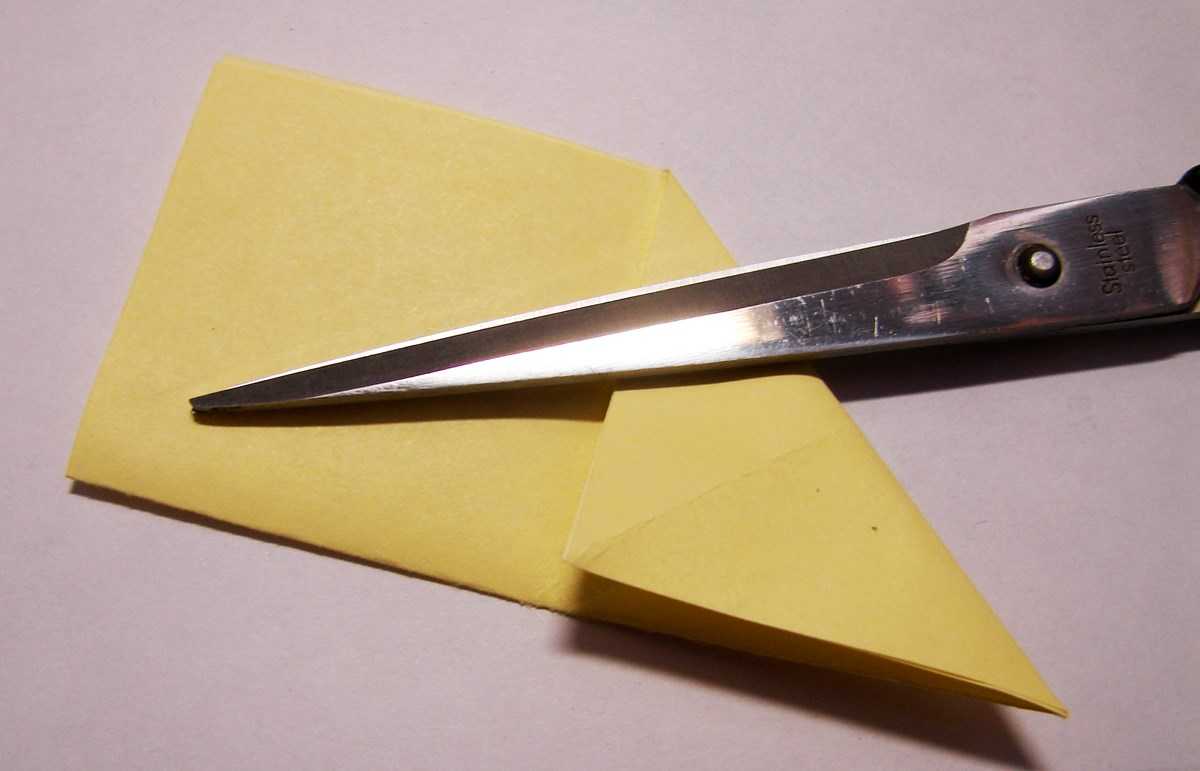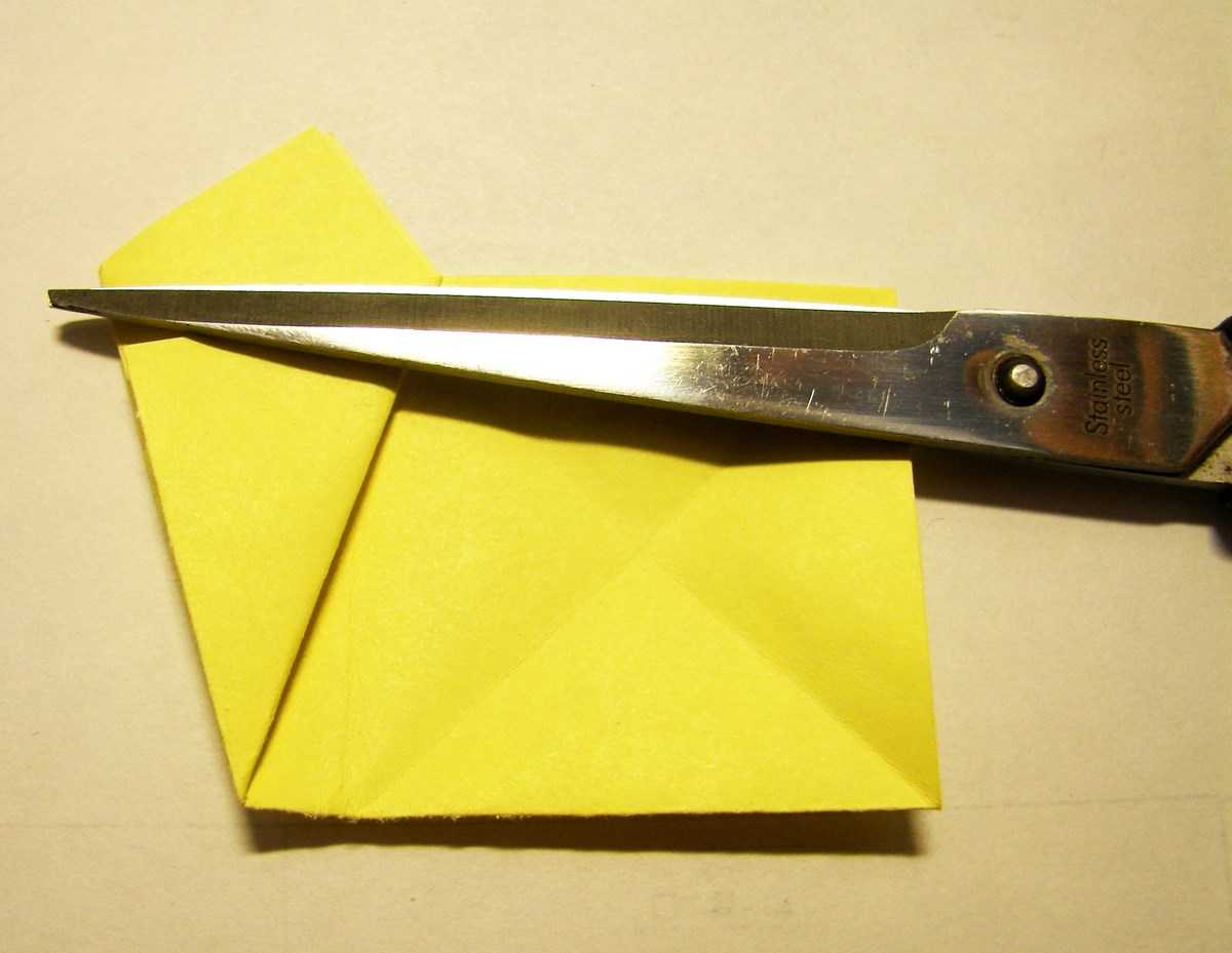 1. Вырезаем квадрат из желтой бумаги (10х10 см). Сгибаем его пополам от себя (сгиб должен «смотреть» на вас).