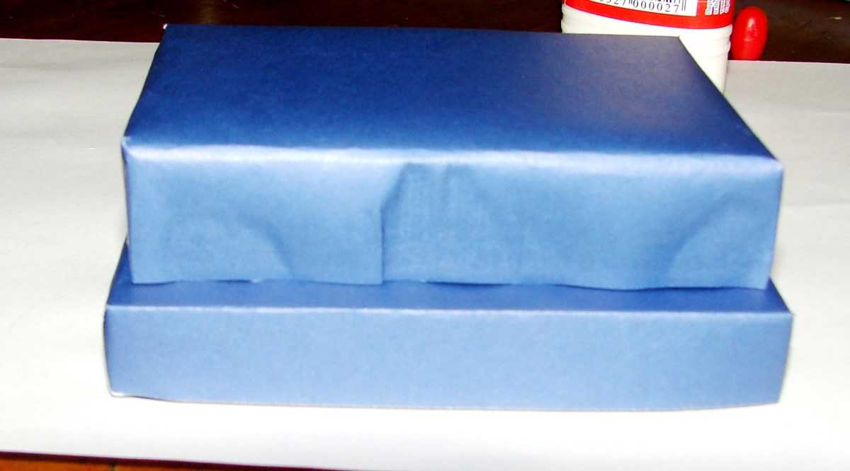 - Поставьте первую часть на вторую, вплотную к краю. Закрепить ее можно при помощи скотча.