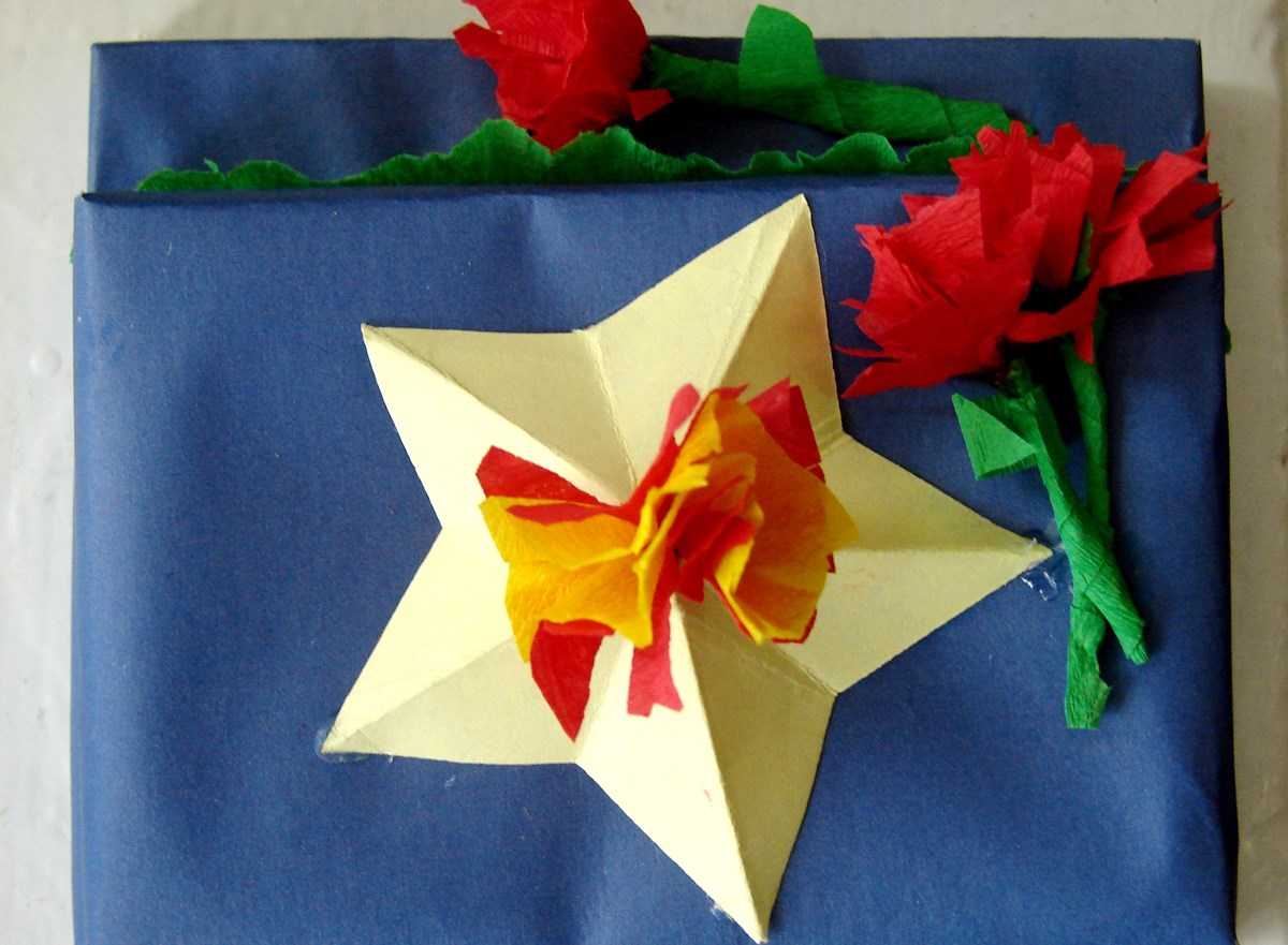 На цветную картонную основу нанесите тонкий слой клея и закрепите объемную звезду. Сверху установите огонь и зафиксируйте его с помощью клеевого пистолета. Украсьте поделку веточками с яблоневыми цветками и зеленой листвой либо георгиевской лентой. Также можно наклеить цифры, соответствующие годам войны, или установить картонные фигурки солдат и бумажные цветы алой гвоздики.