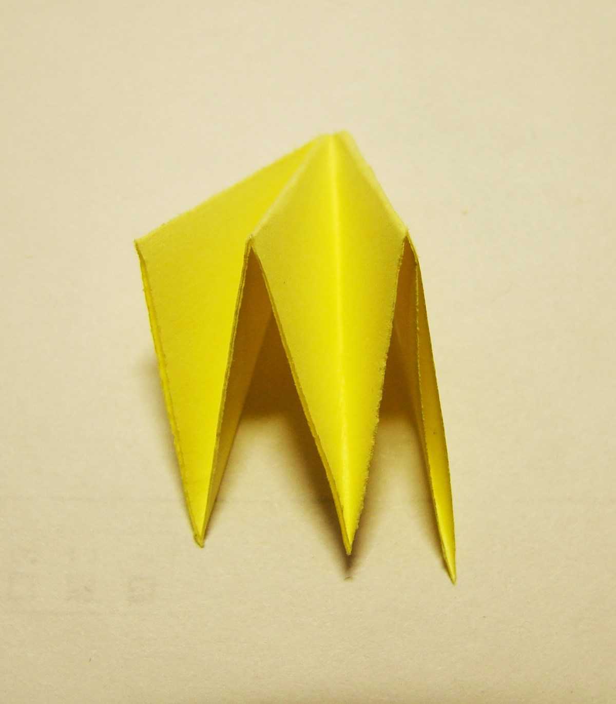 Потребуется 5 бумажных (картонных) квадратов. Квадратную заготовку сложите пополам, а затем сдвиньте верхний угол вверх. Далее складывайте деталь согласно схеме: