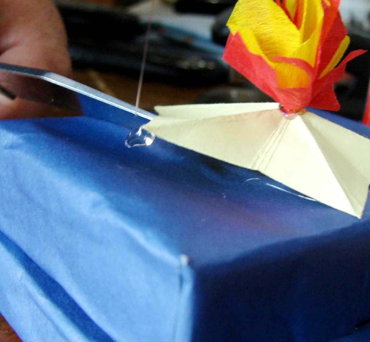 - Вставьте пламя в получившееся отверстие. Делать это нужно аккуратно, чтобы не порвать детали. Для это можно помогать себе иглой или зубочисткой.