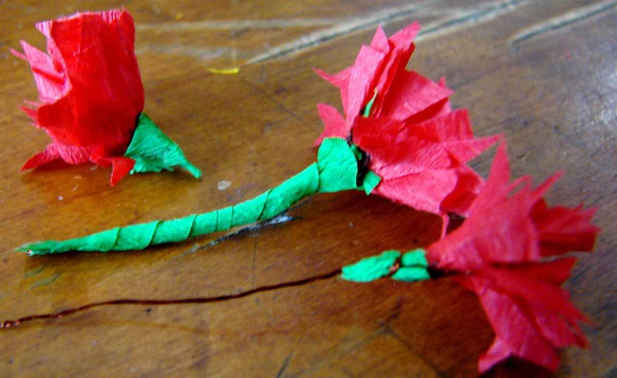 24. Делаем гвоздики: квадратики малиновой бумаги складываем в «уголки», как для звезды. Подклеиваем чашелистик, прикрепляем проволоку, подклеиваем полоску зеленой бумаги и делаем стебель.