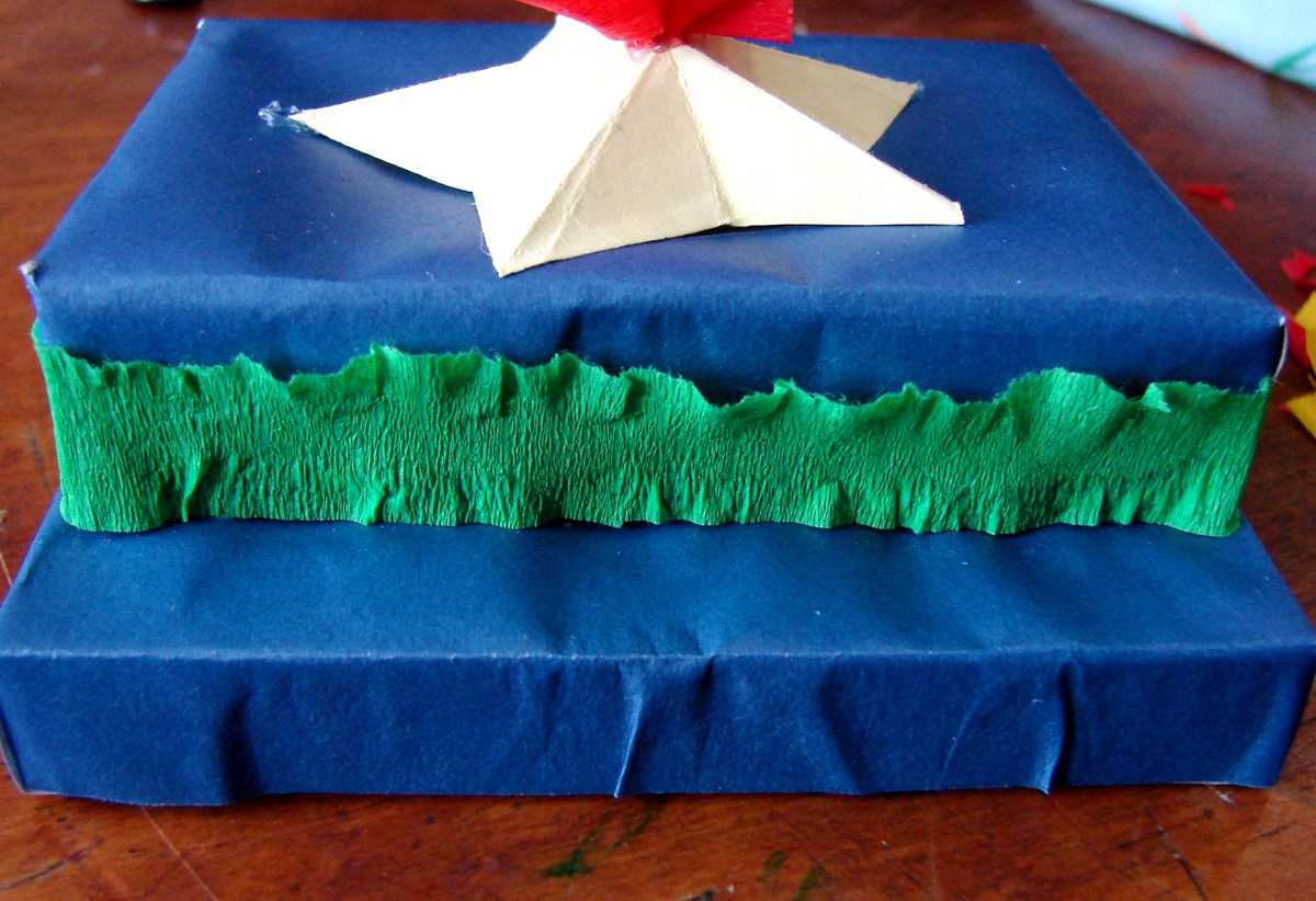 20. Для «постамента» можно взять две небольшие коробочки от игрушек, обклеить их цветной бумагой, склеить вместе в виде горки.