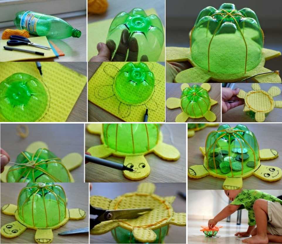 В качестве панциря послужит дно бутылки, которое нужно аккуратно отрезать. Затем его необходимо приложить к листу и обвести маркером. К полученному шаблону добавляют лапки и голову будущей черепашки. По контуру надо вырезать шаблон зверька, потом приложить к губке и вырезать ее. На основу черепахи водружают дно бутылки и прикрепляют с помощью нитки, прошивая иголкой через губку. Сверху обмотанные нитки вокруг панциря соединяются небольшим кусочком нитки и украшаются пуговицей.