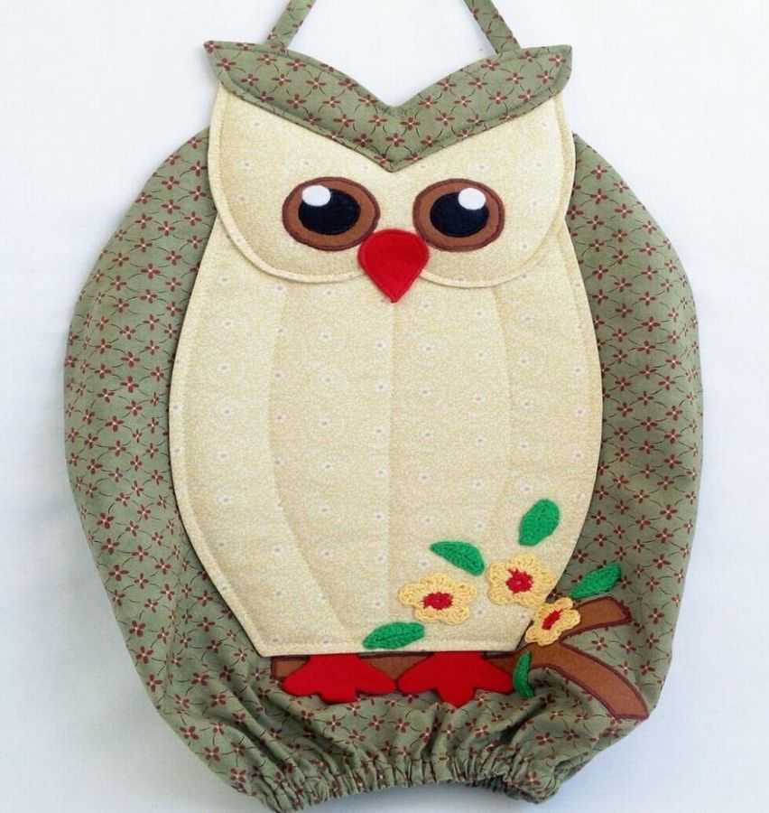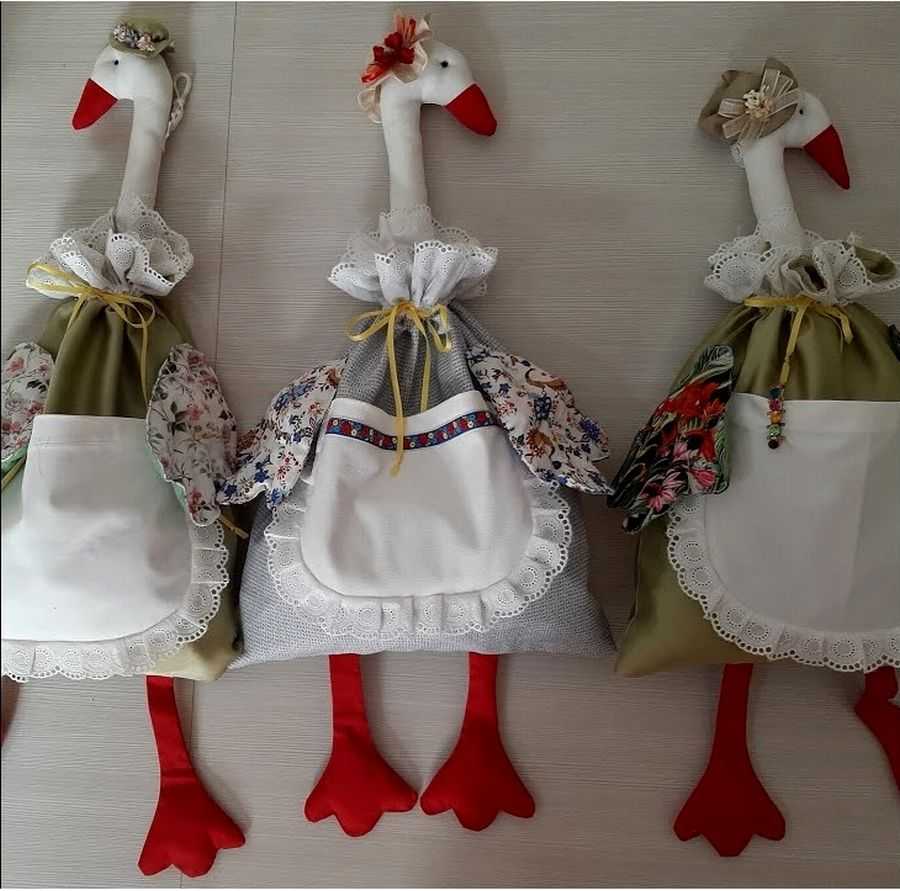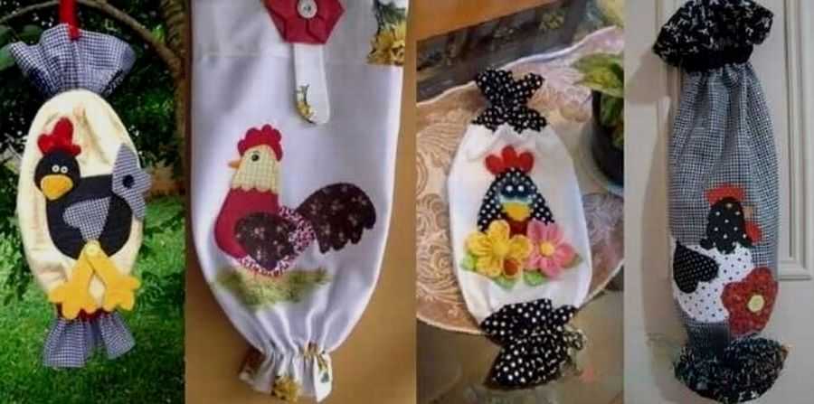 Так же очень мило выглядит пакетница в виде курочки. Такой вариант хорошо выглядит если сделан из ярких материалов. Тут, как и во всех случаях необходимо вшить верёвку для закрывания.