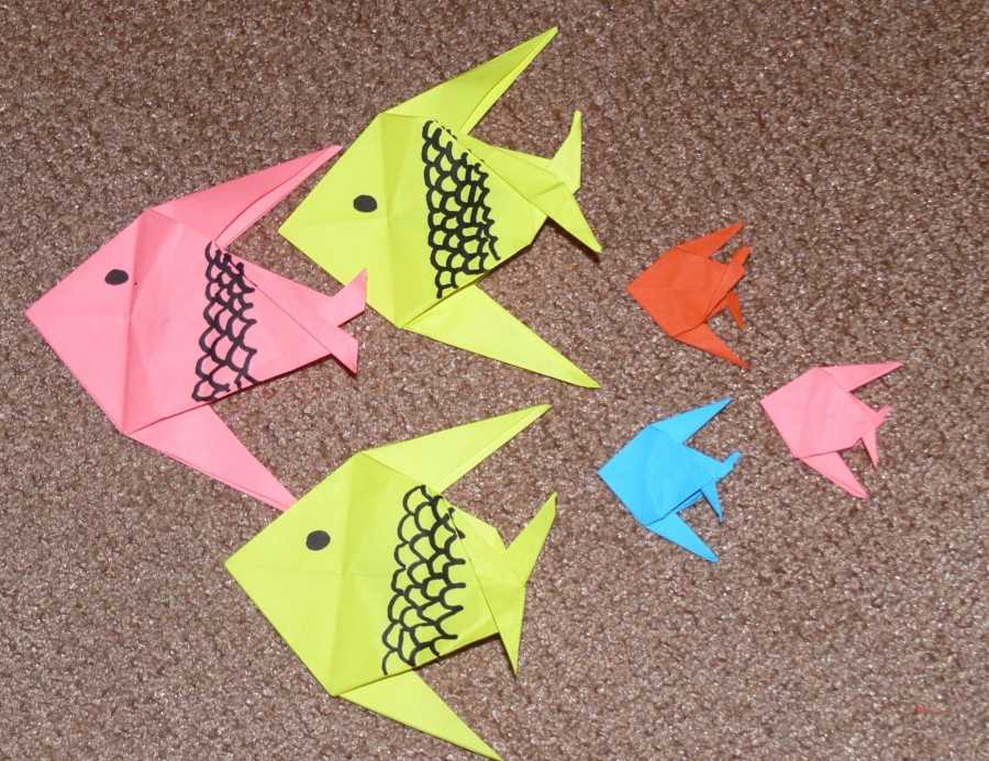 Теперь вы знаете разные техники, как сделать рыбку из бумаги, пластилина, оригами. Если применить немного фантазии, сделать разного размера цветных рыбок, они будут отличаться и создадут стайку в аквариуме или на картоне.