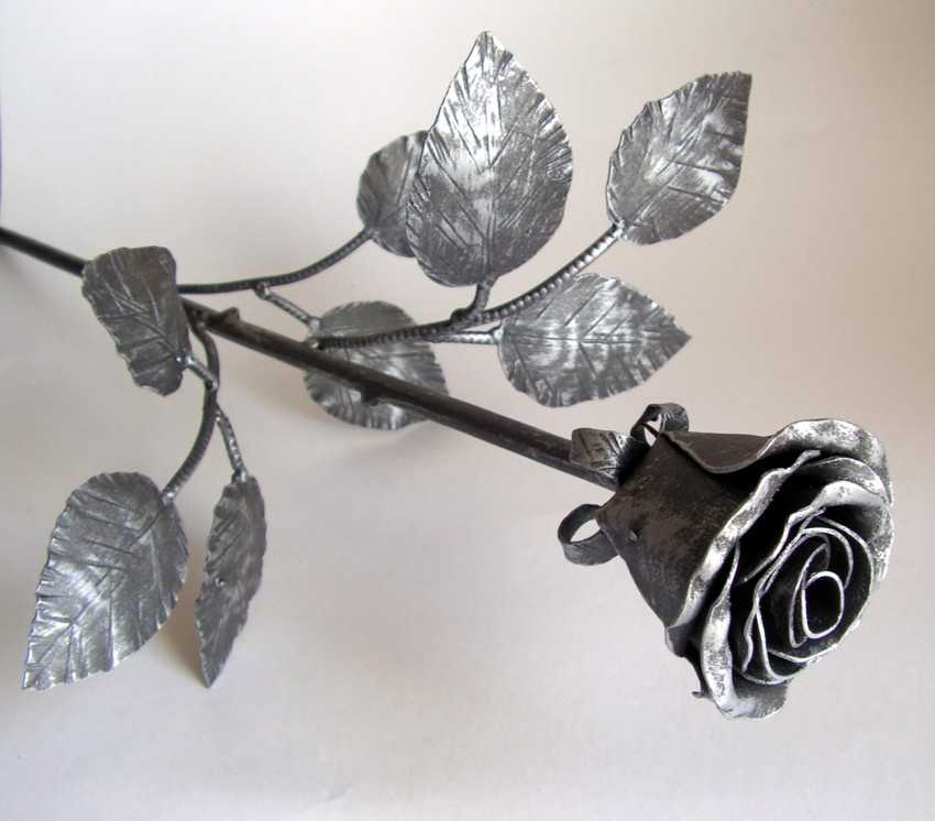 - Розы – это не новая, но полюбившаяся многим тема. Для этого понадобится применить аппарат для сваривания. Ножницами для металла нарезаются около 30 лепестков. На точильном камне разглаживается неровная плоскость. Стальной трос закручивается в форме спирали с помощью плоскогубцев. Лепестки один за другим навариваются на ствол. Также и шипы привариваются сварным аппаратом. Делается зачистка швов болгаркой, а сверху розочка окрашивается.