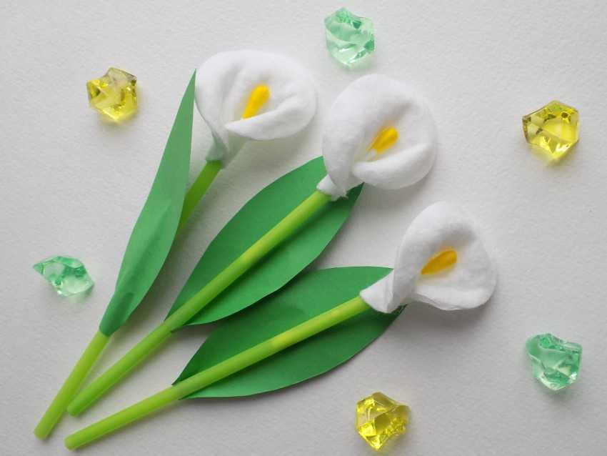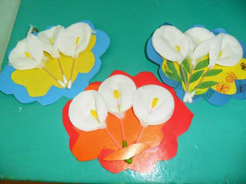 Несложными, но не менее прекрасными, будут поделки из ватных дисков в виде цветов. Выше мы уже рассказали, как сделать букет калл. Также, отличным решением станут подснежники, розы или ромашка — мы предлагаем рассмотреть еще несколько вариантов.