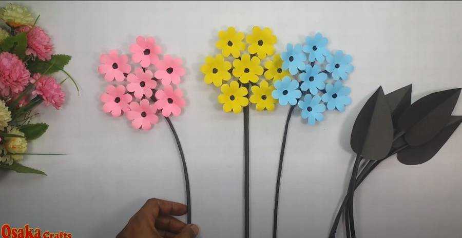 Цветочки маленькие, в одном цвете, крепятся к стеблю клеем. Желательно соблюдать равное расстояние, что бы не было нагромождения цветочков в одном месте. Попробуйте выполнять наклейку цветов с линейкой, чтобы не запутаться. На один цветок автор делает три разных цвета. Смотрится неплохо, но можно попробовать выполнить три цветка, каждый в своем цвете.