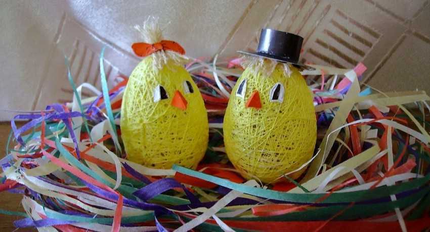Прежде всего, следует подготовить несколько сырых яиц, желтые нитки для вязания, клей ПВА, но и конечно шпажки из дерева.
