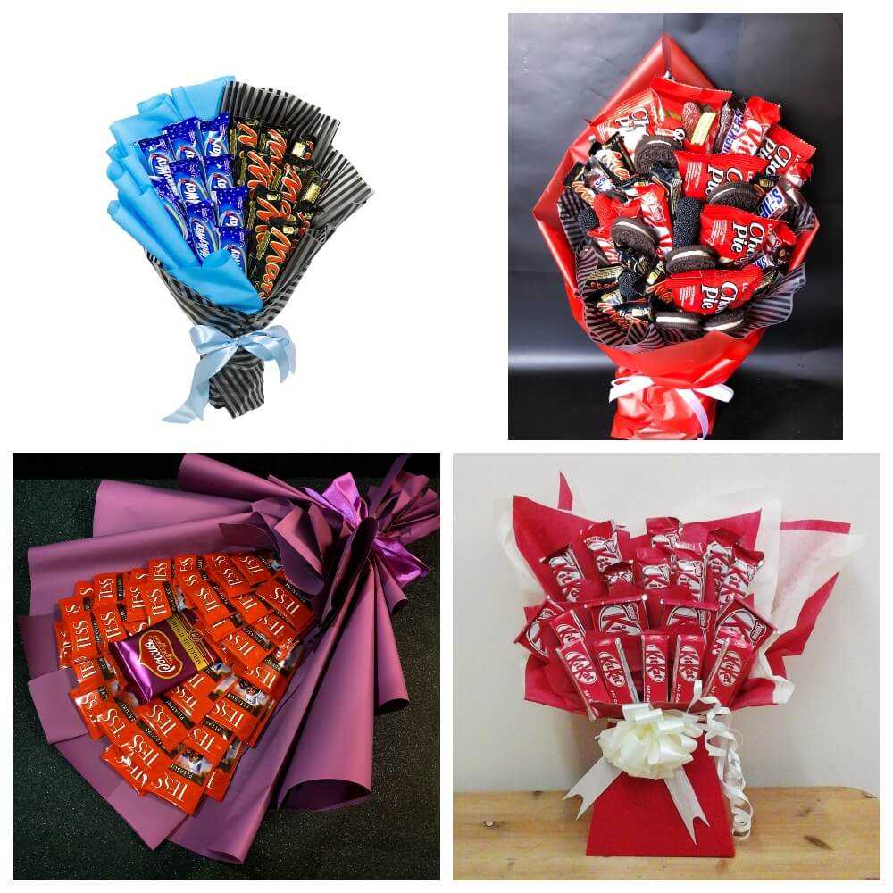| На определенную тематику | Все элементы букета посвящены определенной теме (игре, мультфильму и так далее). | Любые сладости, которые можно обернуть самодельными обертками. |