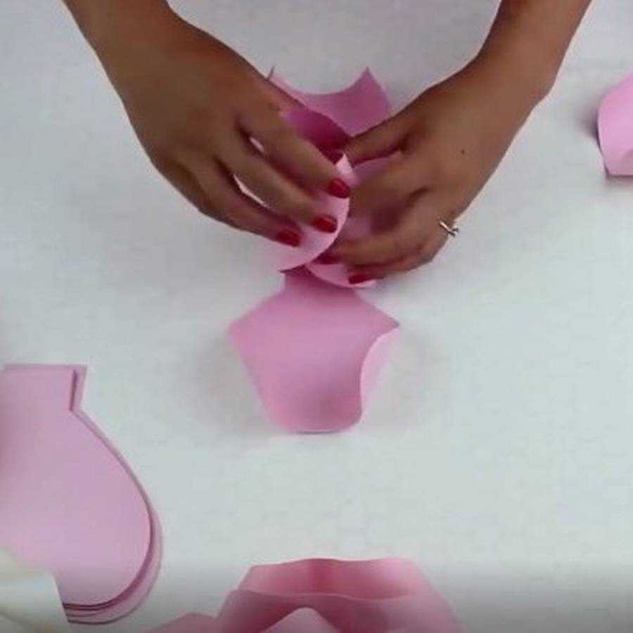 Шаблоны для розы будут разного размера. Подготовьте их заранее. Вырезав по шаблону лепестки, склейте их по два одинакового размера, друг к другу за ножку. Сложите лепестки по два, друг на друга, крест – накрест. Закрутите их внутрь по краям. Лепестки малого размера являются лепестками для изготовления середины цветка. Самые большие уже будут крайними лепестками, которые надо будет подкрутить во внешнюю сторону. Это придаст цветку пышности и схожести с настоящими лепестками розы.