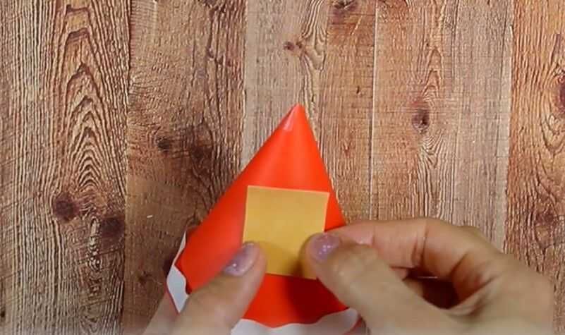 Сложите бумажную тарелку вдвое. Сделайте из цветной бумаги лицо. Пошагово соберите колпак.