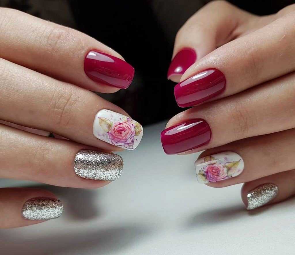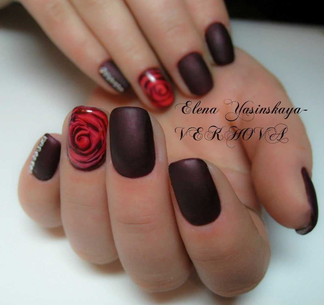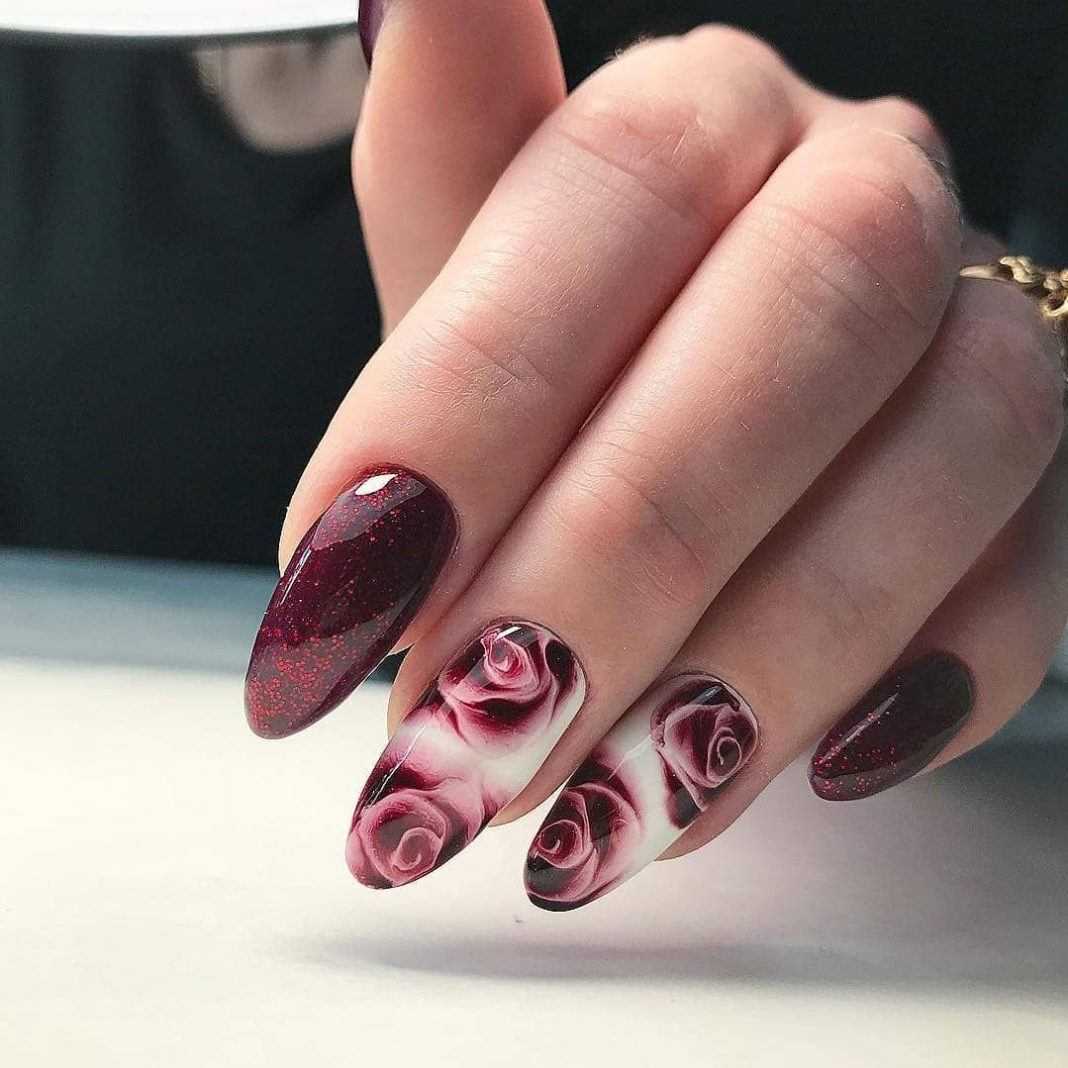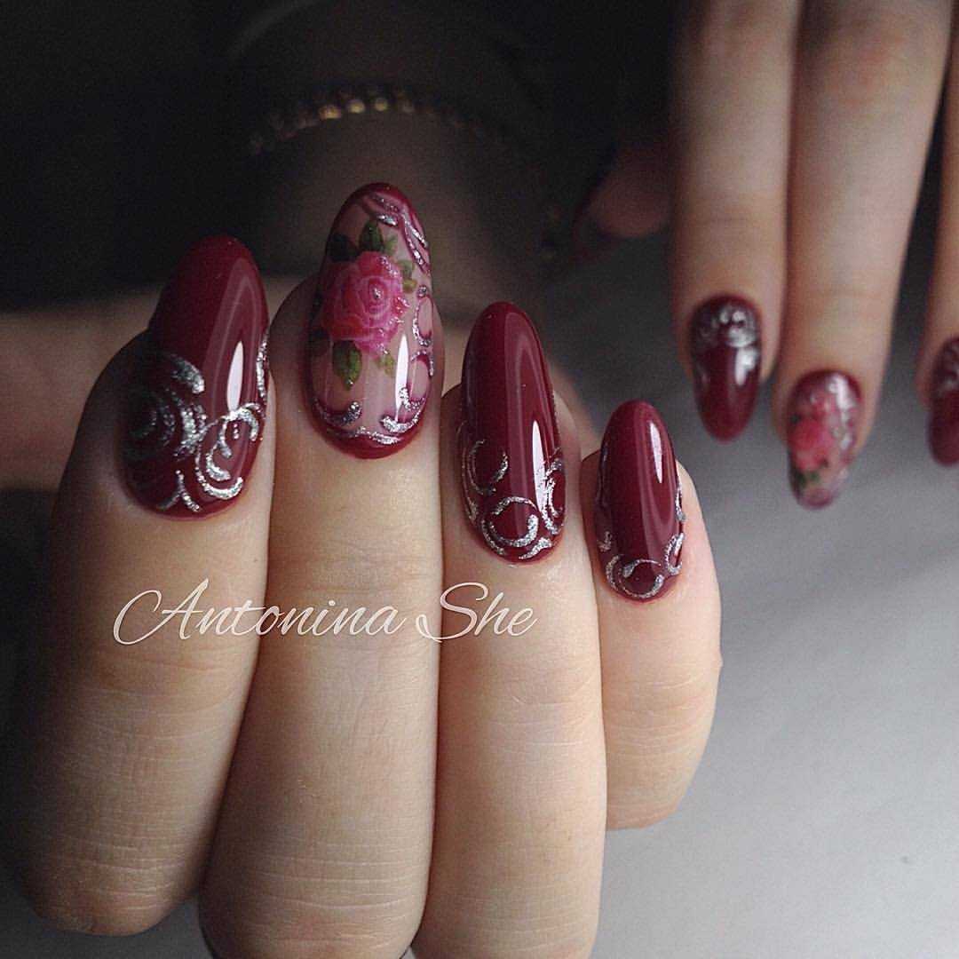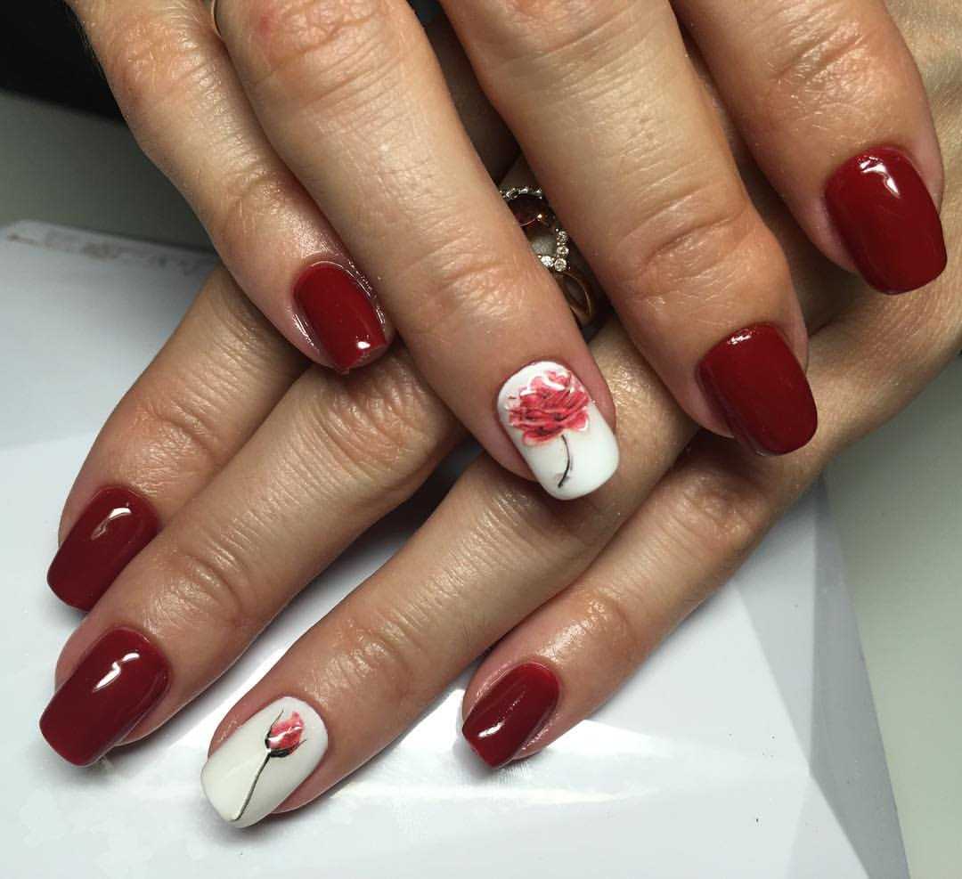 Говоря о флористике имеется ввиду огромное разнообразие цветов, в том числе абстрактных и не существующих, которые можно расположить на бордовом фоне. Самым популярным цветком, который используется с красной и бордовой цветовой палитрой, считается роза. Этот благородный и красивый цветок не только смотрится привлекательно, но и придает своей обладательнице нотки шарма и загадочности. Благодаря объемному рисунку, маникюр получается красивее и ярче. Дизайн можно выполнить художественной росписью, нанести рисунок и посыпать “сахарком”. Для маникюра можно использовать розы в черном, бордовом, белом и других насыщенных оттенках.